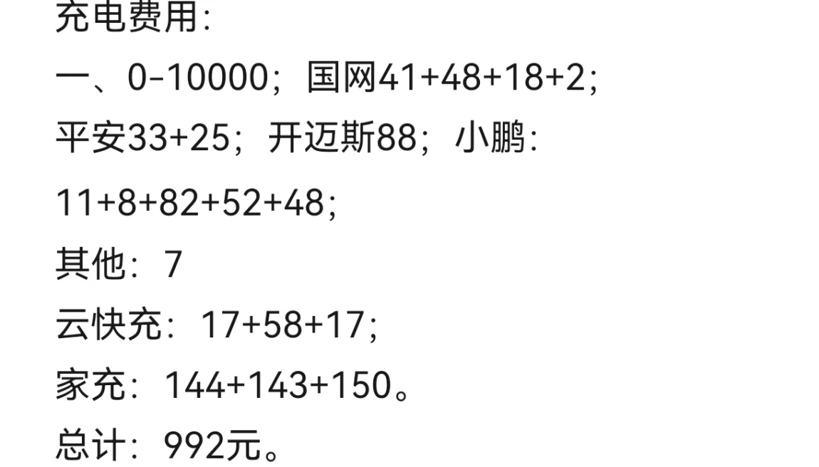 一,充电费用。由于初次使用电车,每一笔充电费用都进行了详细记载。1w公里所有充电费用992元。(包含了平台领券,其他地方薅电,也充了好几次贵电,多数时候是家充),每次的费用见后面的图。