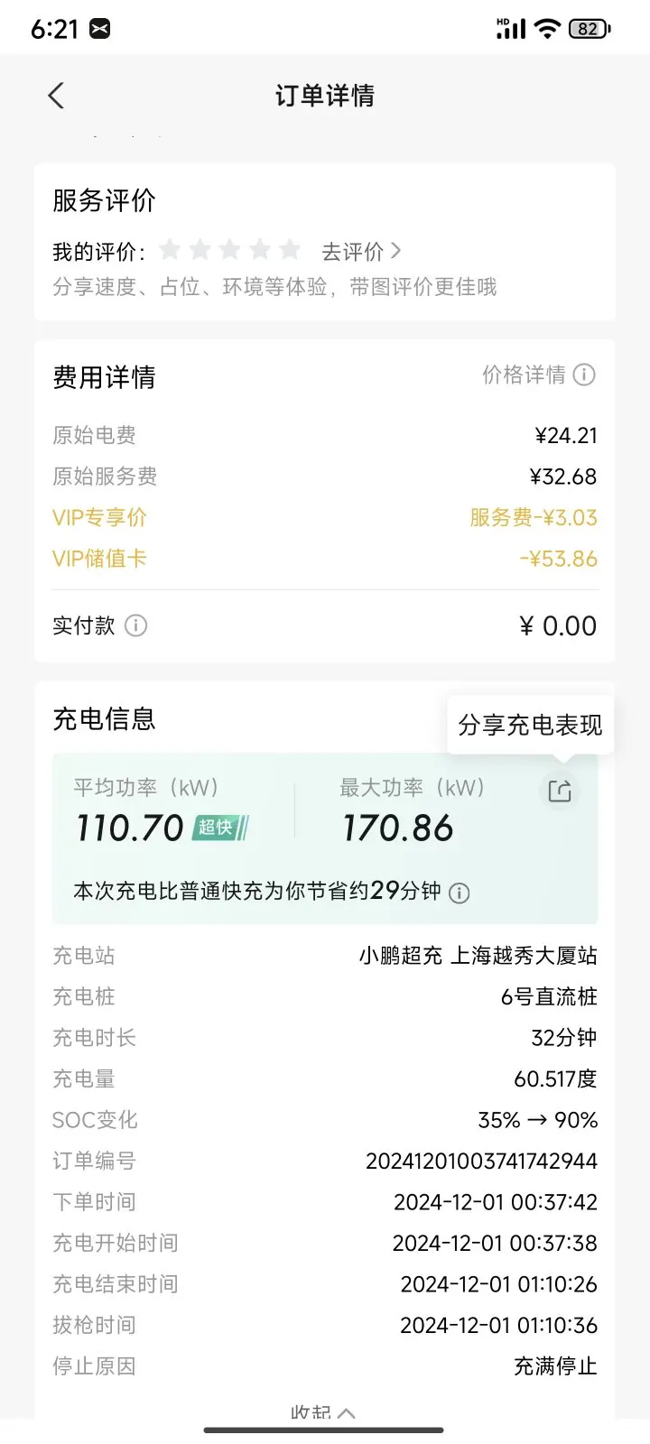 然后就是充电,同样上图,半个小时就冲到了90%,不能速度快,电费还便宜,自驾出行省了不少钱。