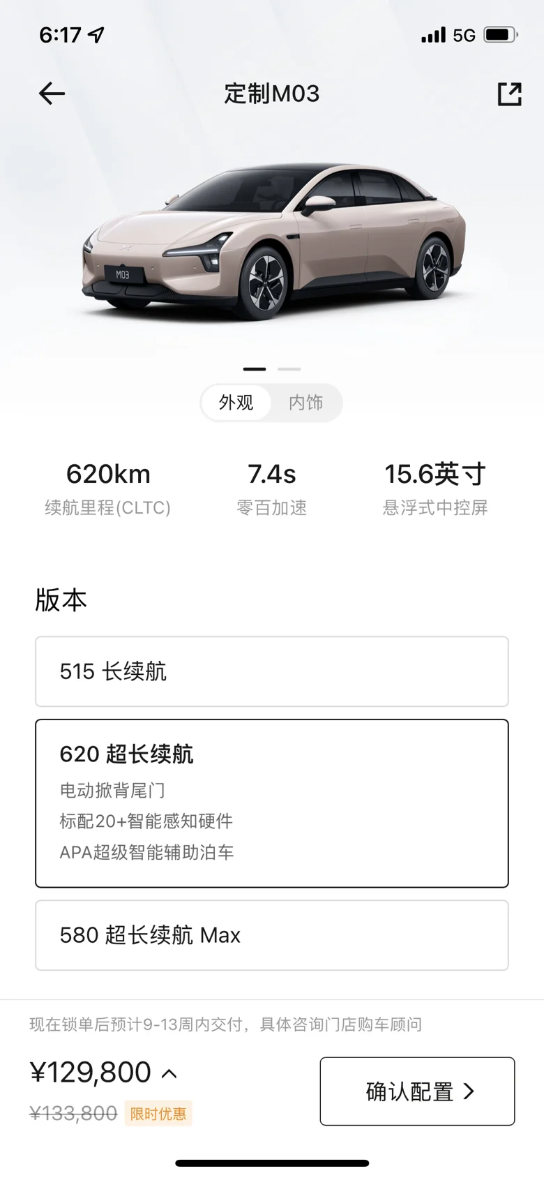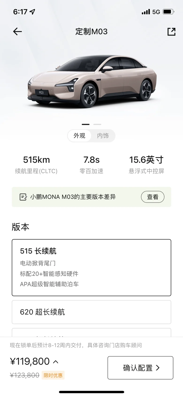 看了一下小鹏现在的620已经是9-13周了,515也需要8-12周,真的是早买早享受啊,等待期越来越久,哈哈,不过好像交付也加快了。小鹏MONA M03周销量突破4千台,稳居新势力纯电车型销量前二,与第一名的差距进一步缩小