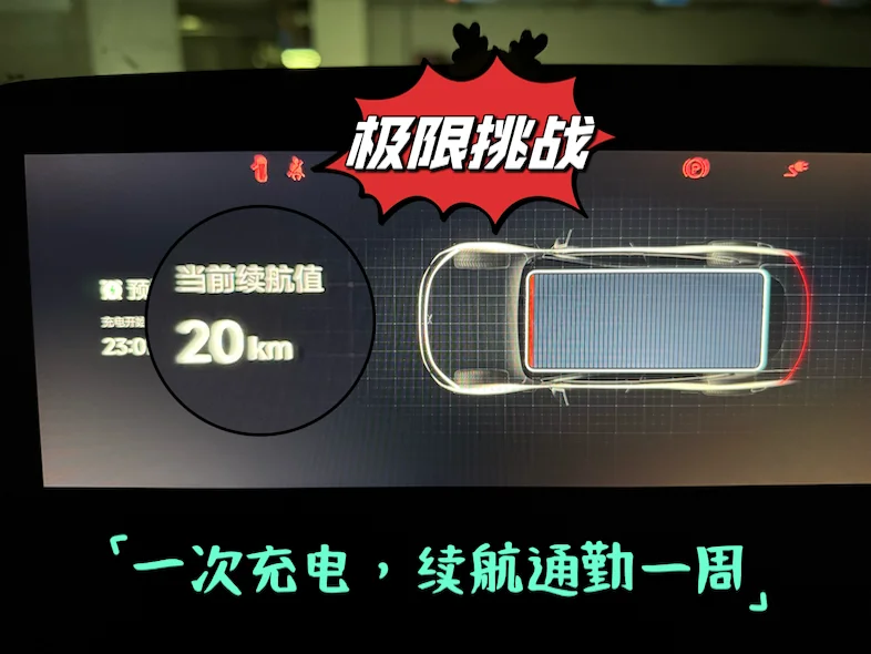 上视频😝,周五到家后拍的视频,挑战一周不充电表显454km跑完实际420km 完美结束,跑完还剩余4%的电量,这周真的很充实🤩。