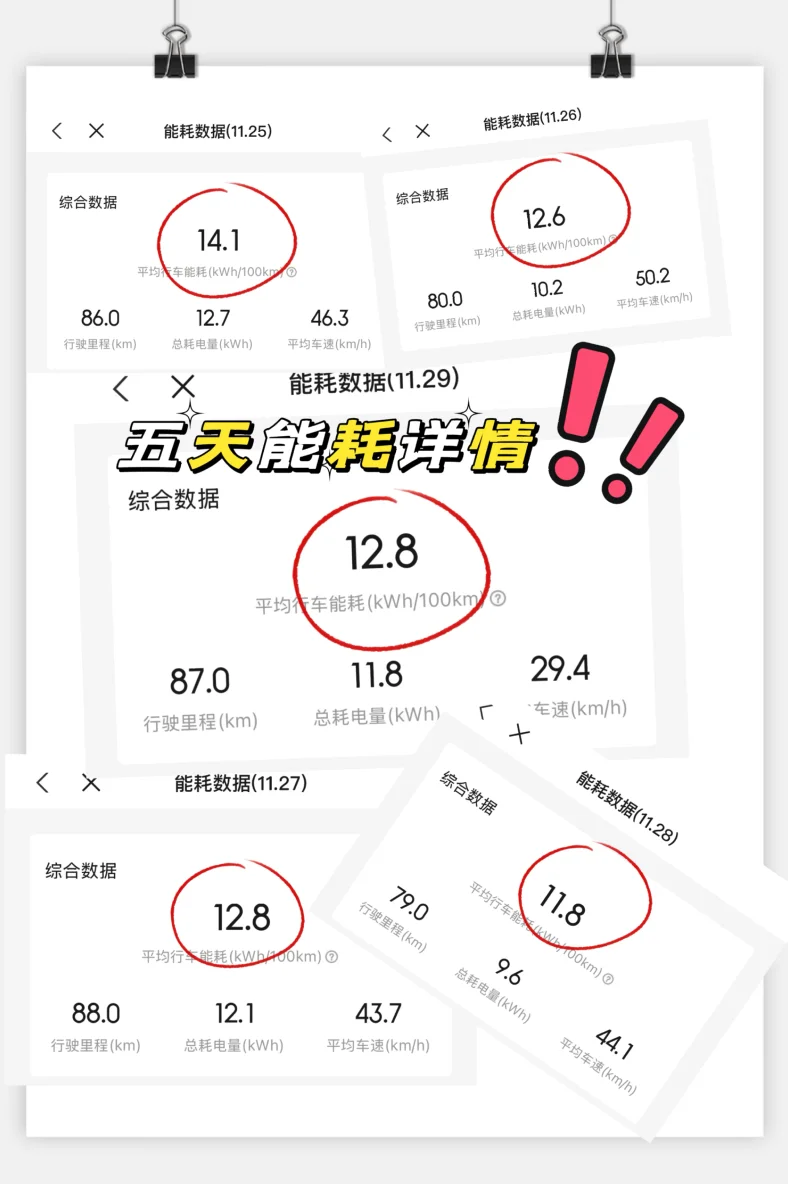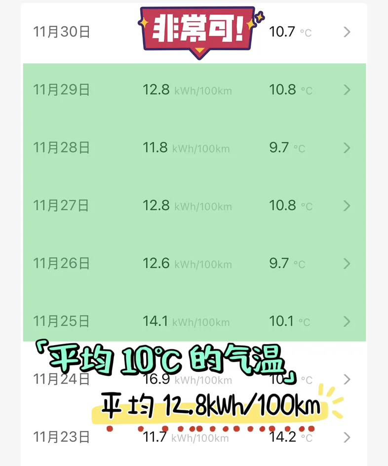 下边一张图是连续5天的能耗情况,共三列,中间显示的是平均能耗,右侧是当天气温情况,基本平均10度左右,平均能耗控制在12.8kWh/100km,相当的不易,黄金右脚重现江湖,大家也可以对比下自己的能耗情况,这里不自夸,自己开车还是有一些心得的#能耗报告# 。