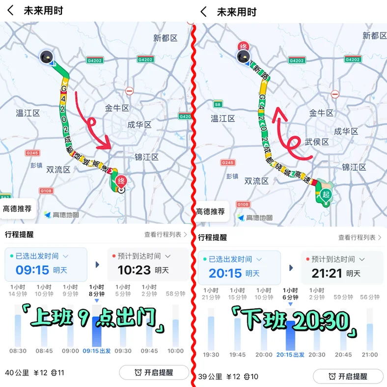 (写文章时间不在早晚高峰,所以实际行驶时间只能使用高德提供的未来用时功能预估一下,差距不大。除此之外,若有顺风搭子,单趟行程会增加几到十公里不等)