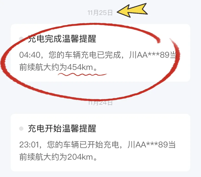下图是小鹏App里的充电通知,充电前204km,充电后454km。