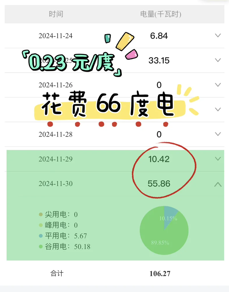 从11月25号周一开始挑战,29号周五晚上完美结束。29号回家插上充电枪充电,如下图29、30号两天的充电度数为: 10.42+ 55.86=66.28度电,谷底电价为0.23元/度,所以换算成电价: 15.24元,再平均算到每一天 15.24/0.23=3.05元/天,通俗讲每天的通勤成本仅为3元钱😲。