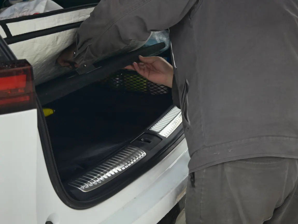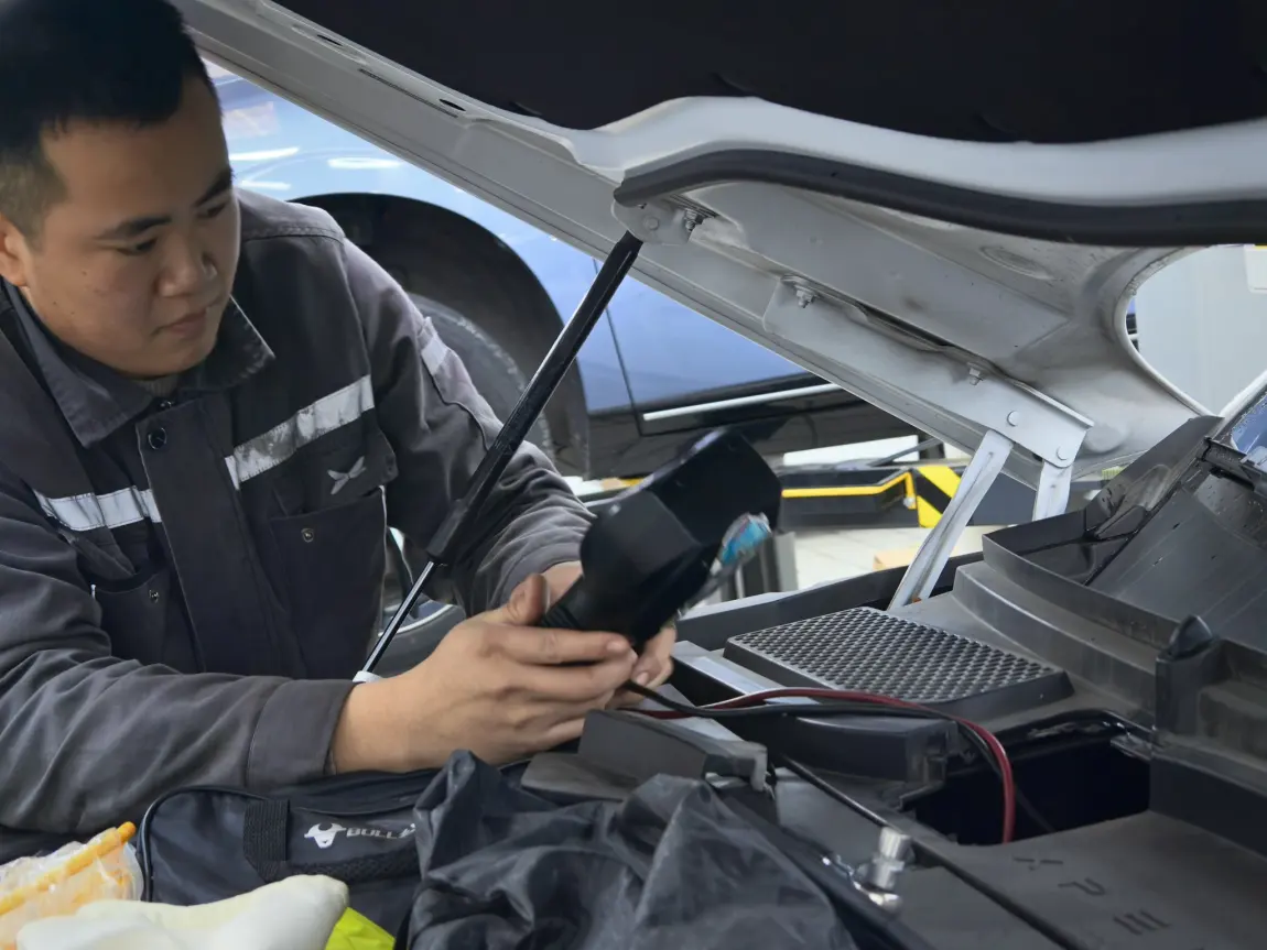 随后,小哥们手持检测设备,围绕车身依次检查小电瓶、底盘、门把手、隐藏后备箱、雨刮器、行车大灯以及中控大屏。小电瓶质量状态显示 100%,健康得很;底盘关键部位逐个查看,确保没有松动、刮擦痕迹;车身各部件反复开合、调试,功能性完好无损;灯光、雨刮、中控大屏也逐一测试,反应灵敏、显示正常。每一项检查都做得细致入微,尽显专业素养。
