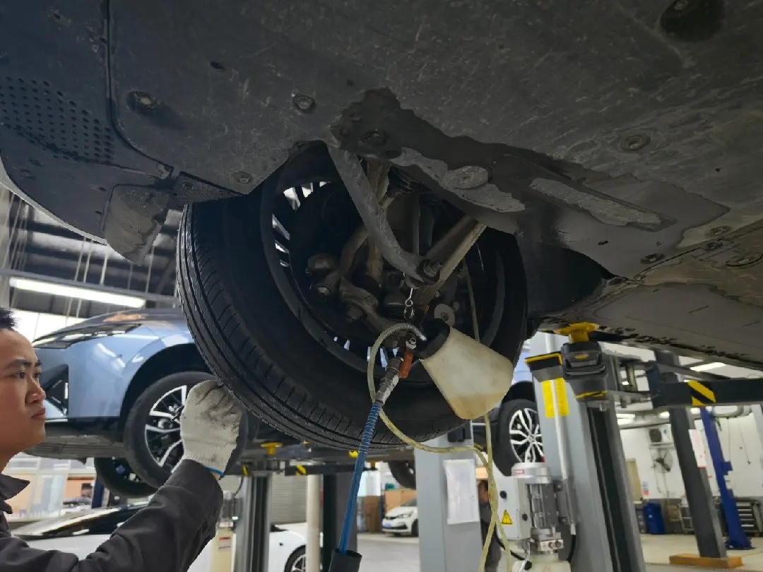 维保小哥登场,那股子专业劲儿一下就展露无遗。更换制动液时,他们启用专用充抽机,手法娴熟、有条不紊。在抽取旧制动液的漫长过程里,小哥时刻紧盯着设备,不间断地补充新制动液,只为严防空气混入制动系统,保证刹车性能万无一失。这份严谨细致,关乎的可是行车安全的大事,让我由衷赞叹。