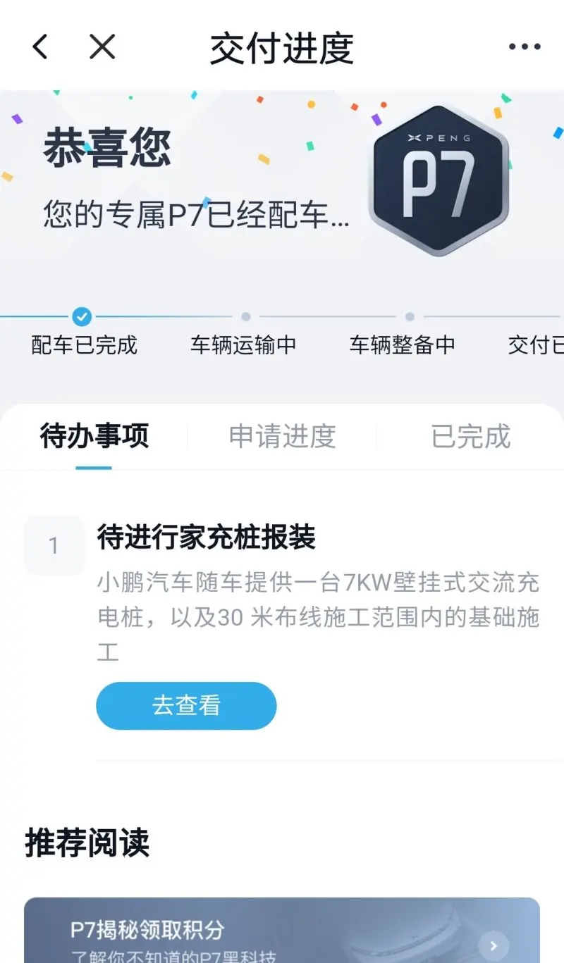 首先,配车完成后,待办事项会出现【待进行家充桩包装】的提醒,这时就可以拨打400进行报装,随后72小时内,会有安装充电桩的人员与车主进行联系,勘察现场,提供后续所需申请材料。
