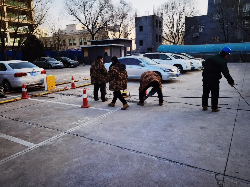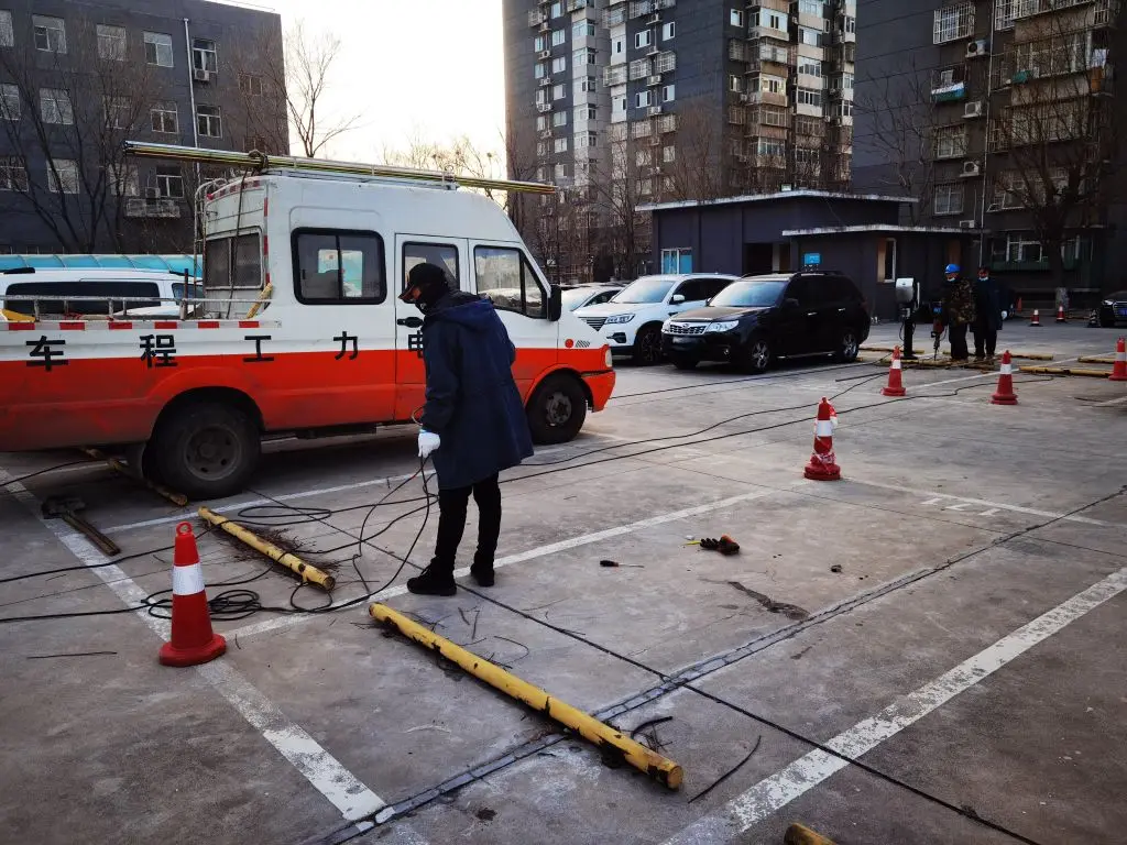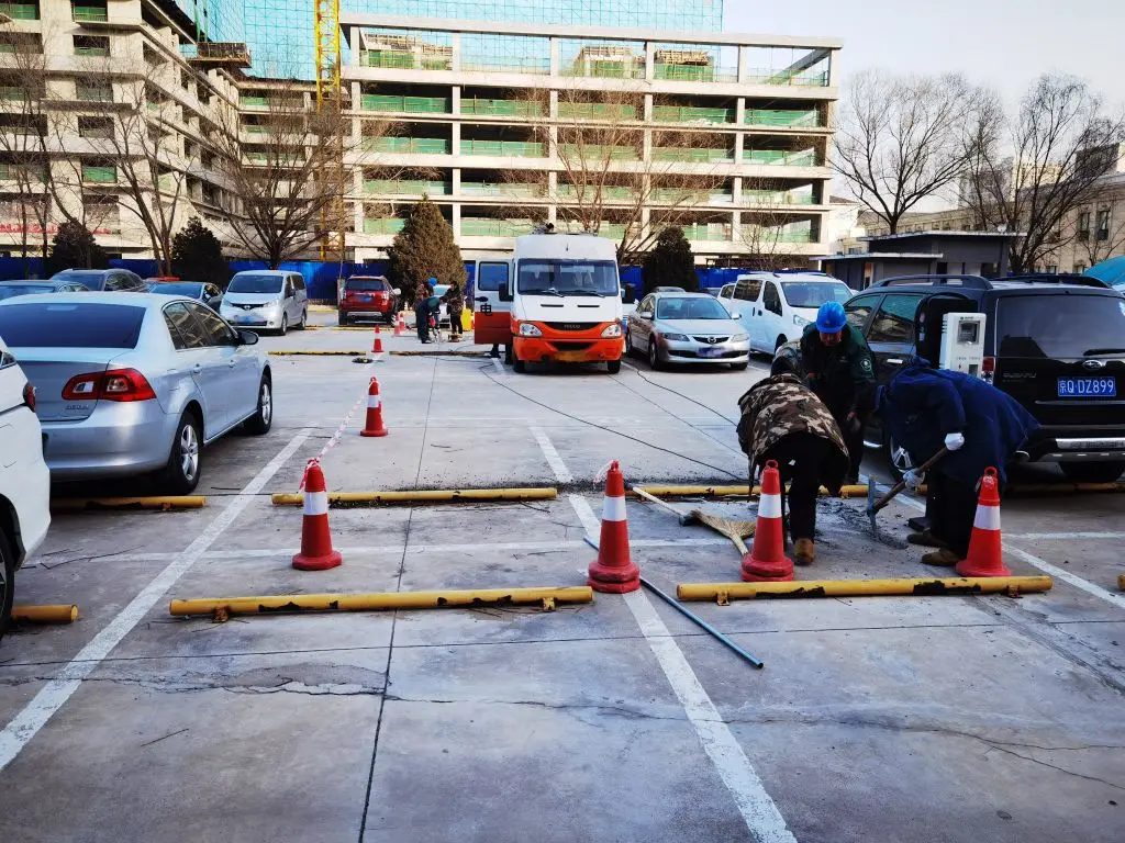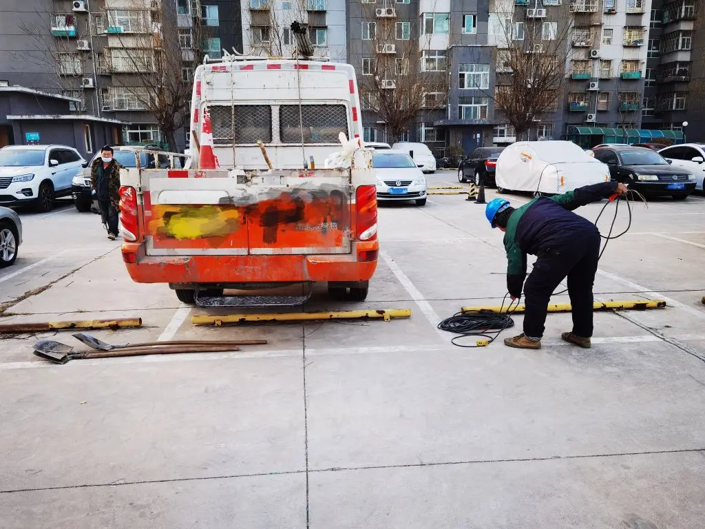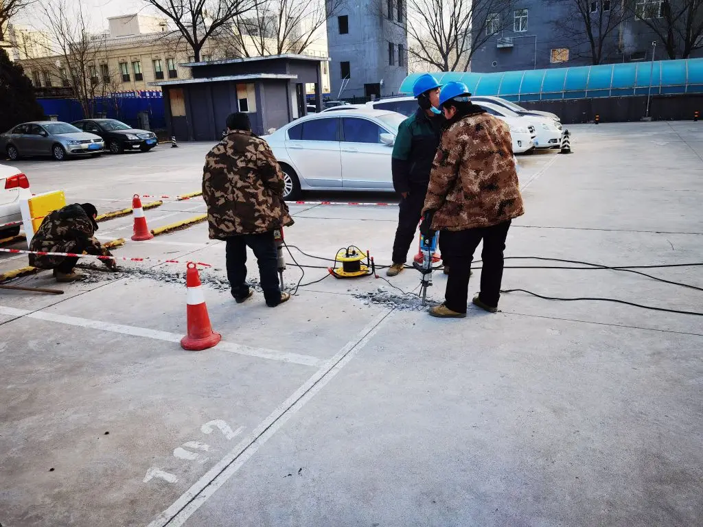 第一个施工过程,是国家电网工作人员,从取源点到我的车位,进行敷设电缆,由于停车场是硬化水泥路面,所以还需要破坏路面,埋完管线后再进行修复,需要提前和走线路径上的车主进行沟通挪车,施工当天,也需要和物业打好招呼。