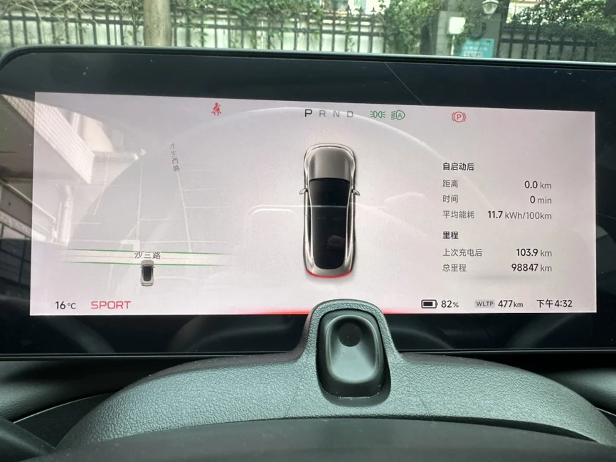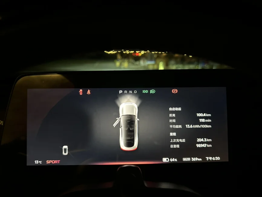 经过了118分钟,差2分钟就到2小时。刚好到了6点30分到达,一共行驶了100.4公里,WLTP续航剩369公里。出发前477公里,行驶100公里一共消耗108公里,所以续航达成率九三折。