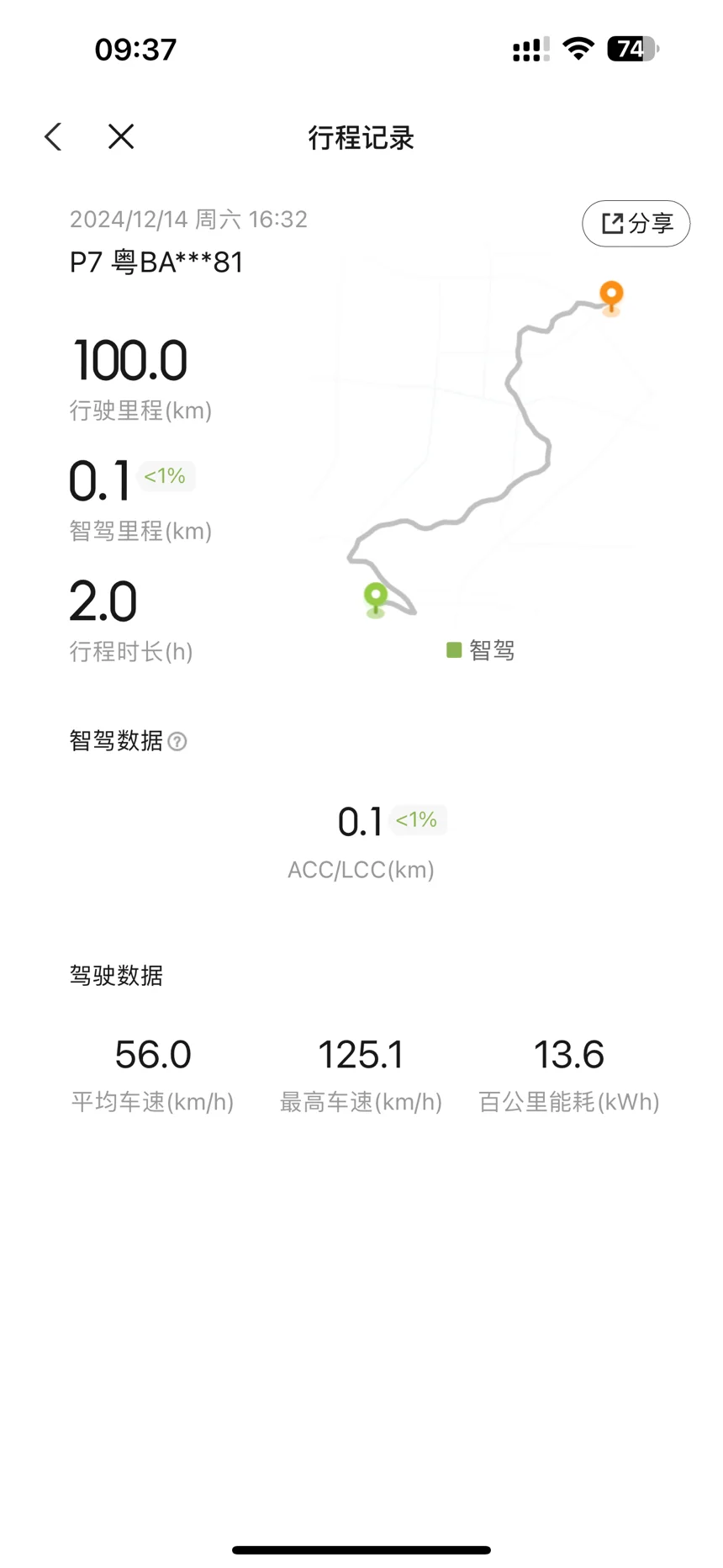 全程车上就我一个人,还有后备箱的一些露营装备。这100公里能耗猜13.6Kwh,我个人觉得P7这个能耗还是很顶的。包括九三折的续航也是很棒的。也是因为这个天气对于电车老说非常友好。