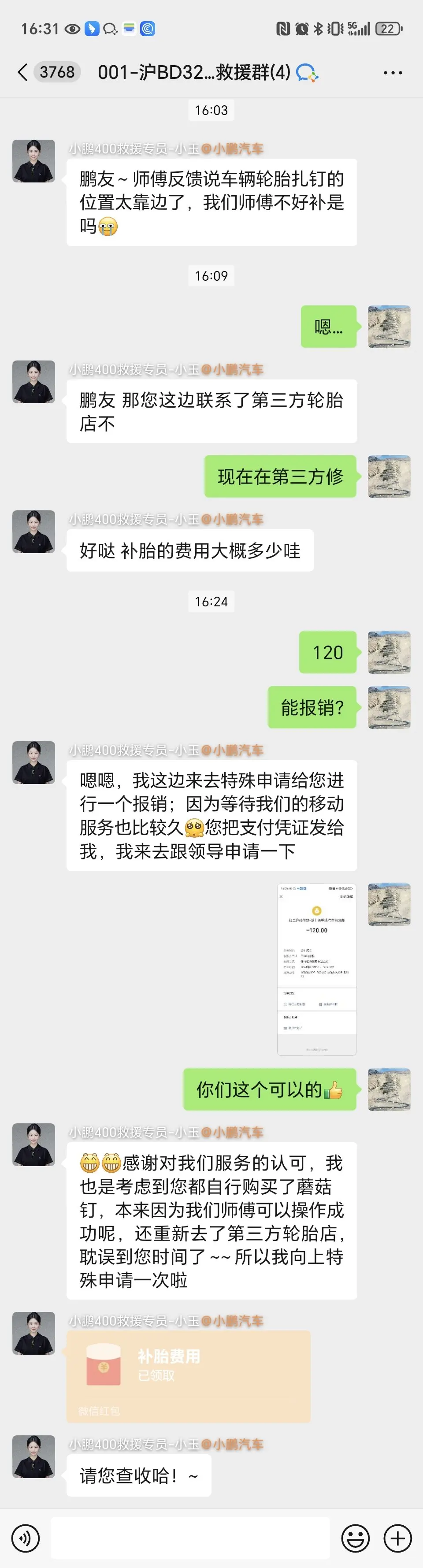 新车提车一个月,各种出门游玩,结果被扎了两次,都是小鹏上门救援,今天这次扎的位置不好,没法补胎,去第三方修的,没想到还能报销,小鹏这服务无敌了。