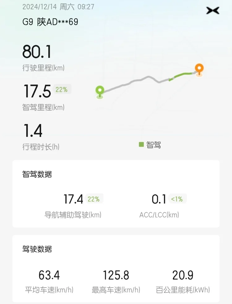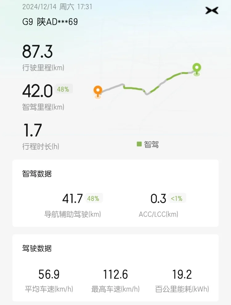 因为中午喝酒的原因,回来是媳妇全程驾驶的,因此回来的能耗就是正常水平,说实话,得益于小鹏优秀的三电控制,G9的电耗我一直觉得不高。