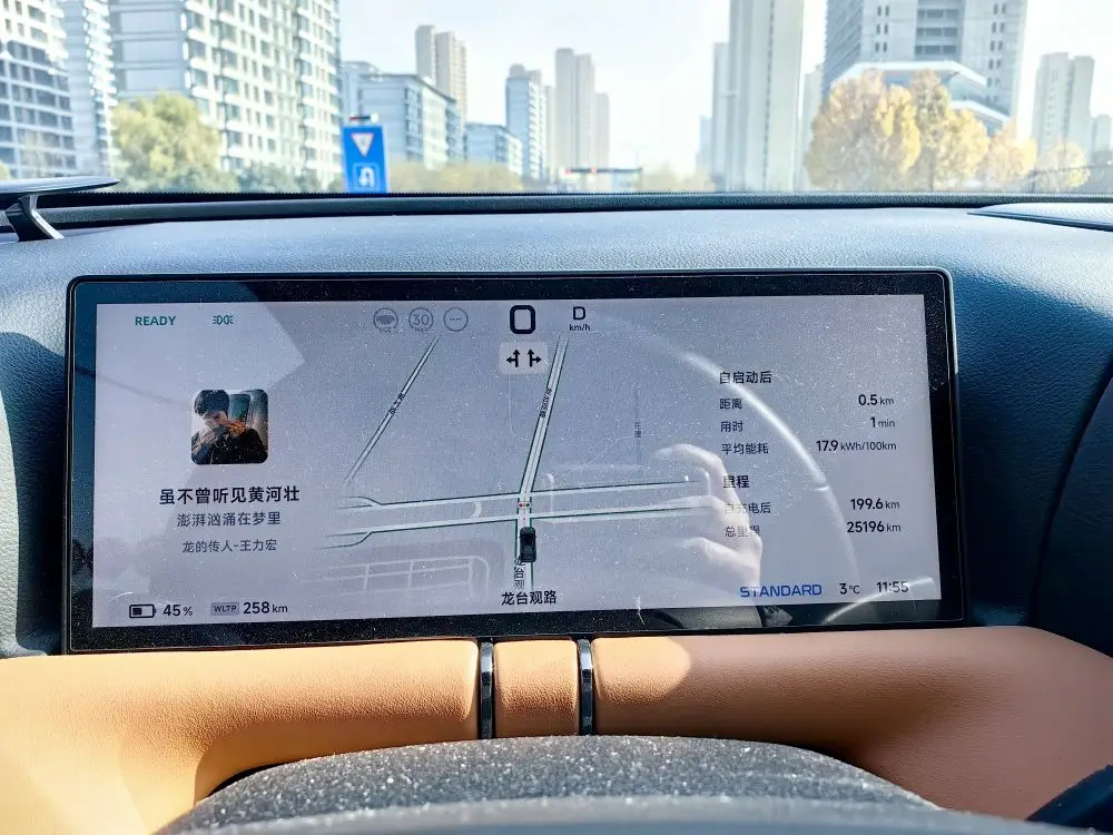 实际能耗:出发前用的家充,充至90%,表显示WLTP续航里程513公里,实际跑了199.6公里,剩余可跑里程258公里,199.6+258=457.6公里,457.6/543=84%