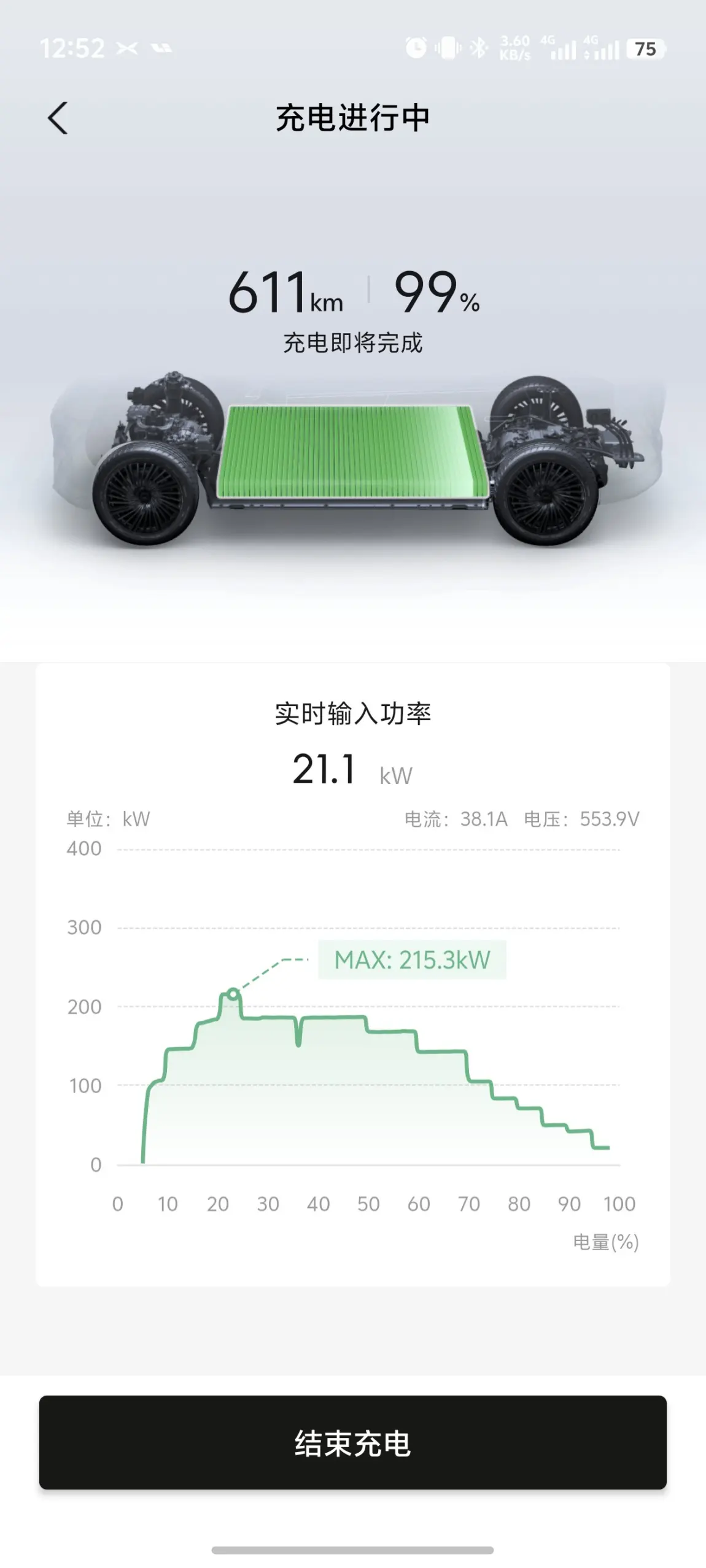 小P第一次吃饱饭小鹏自家奶居然可以充满100%从5%-100%用时38分钟最高功率215.3kW就算是到了99%的时候也还有21kW去自家桩充电只需要两个动作插和拔连出停车场都不用输车牌就能自动减免就是方便