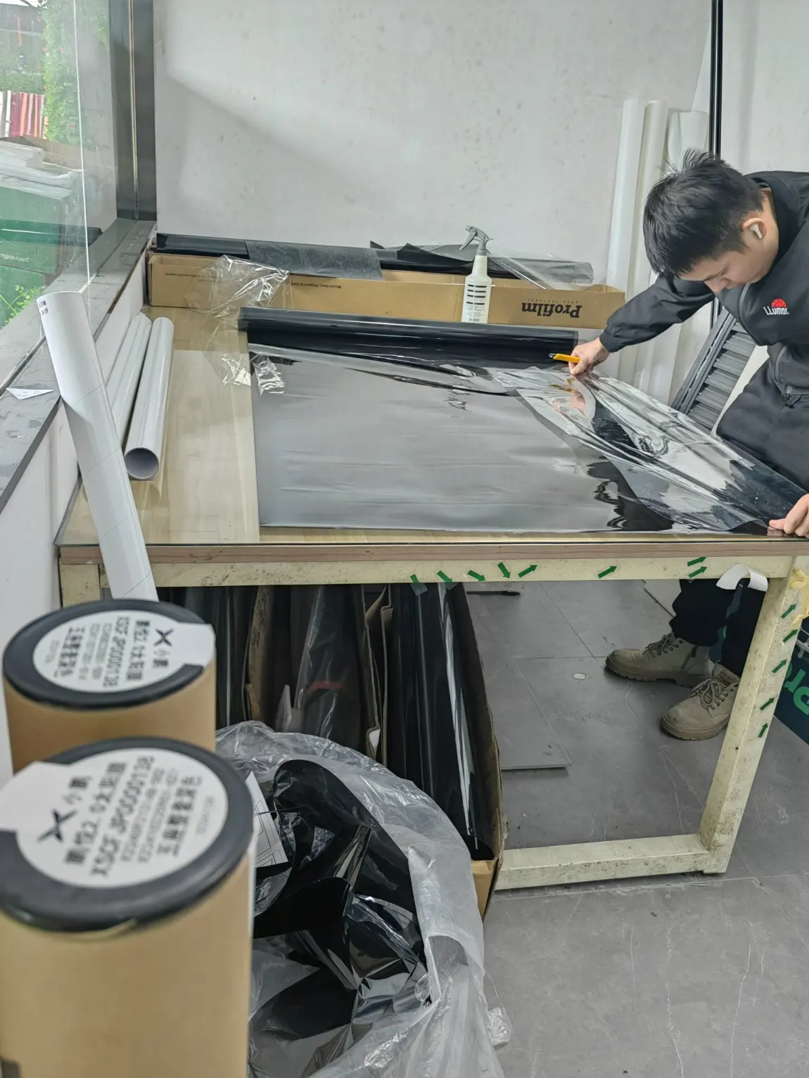 贴膜师傅简单洗了下车,确保车窗、前后档无尘,然后小心翼翼的裁剪车膜,再一点点的贴到车窗上,用工具仔细的刮平赶出气泡。