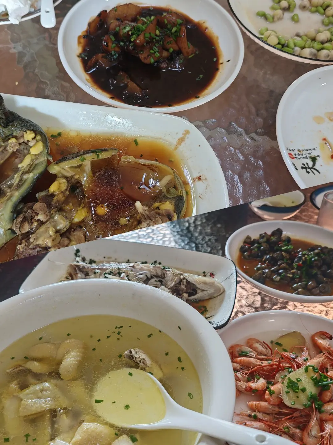 小鹏友还怒干了四碗草鸡汤,滑嘟嘟丰腴鲜美的鸡肉也啃了两大块。鲫格朗、螺蛳、河虾、莲子毛豆也好吃,熏牛蛙端上来还是热的,吃上去嫩嫩的,感觉跟买回去的口感还是不一样。等清蒸甲鱼上桌,已经都饱了,尝了几口直接打包。