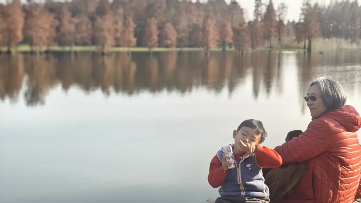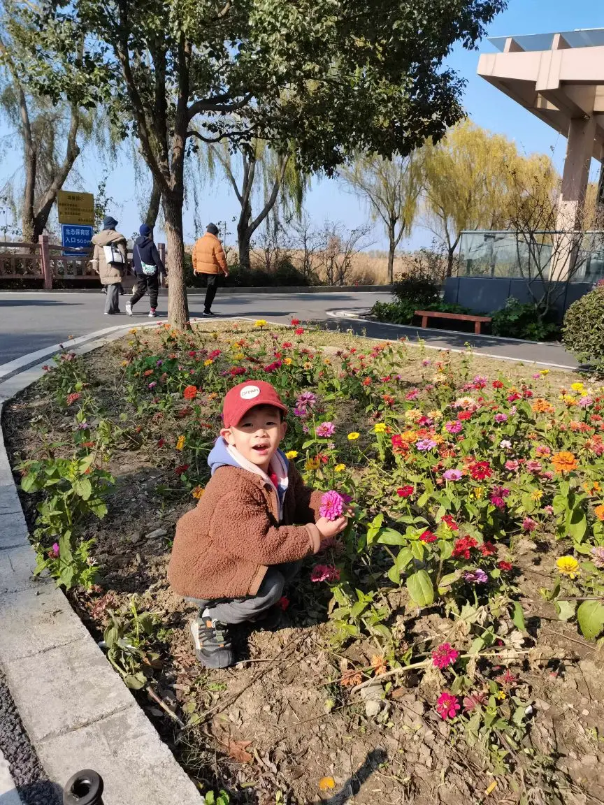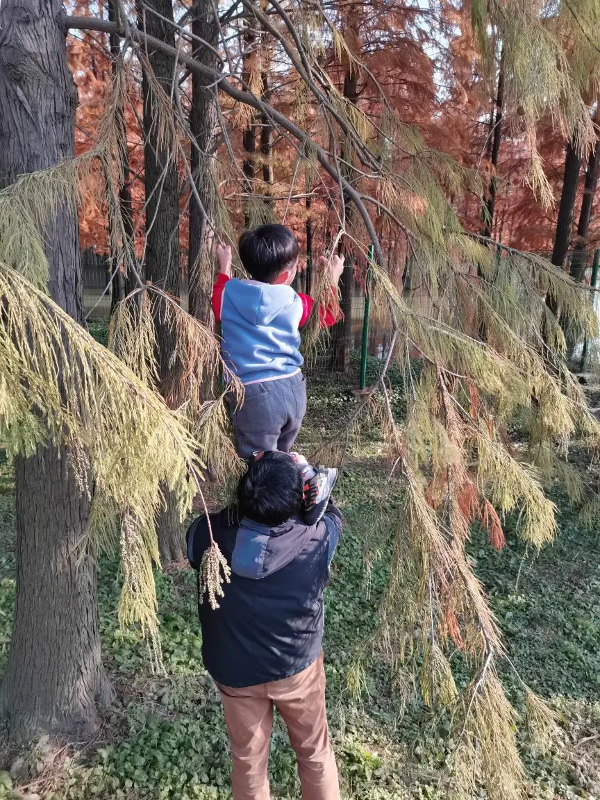 小鹏友还爬到爸爸身上,采了一把水杉树的果子下来,又是一个大丰收。