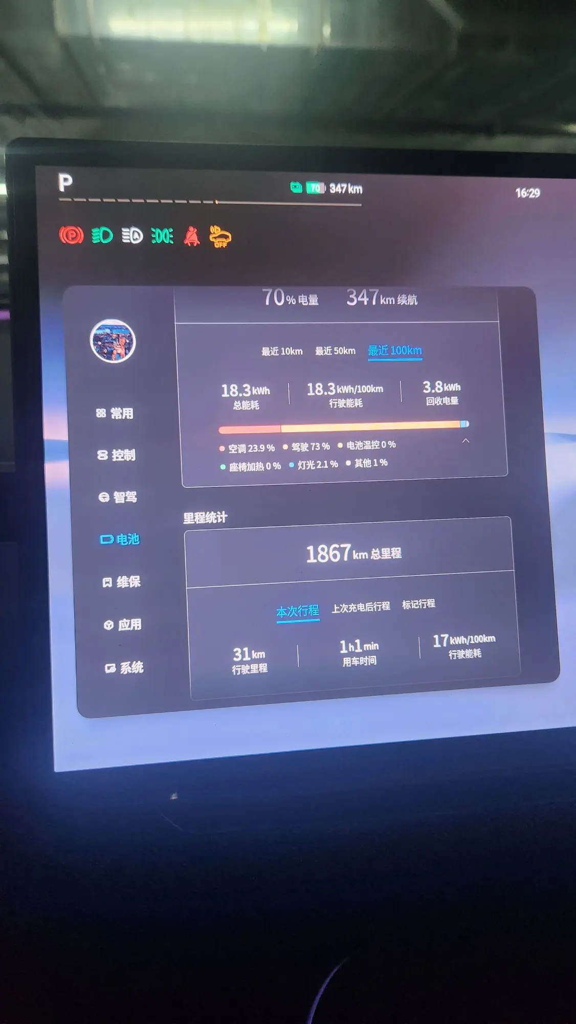提车第二十三天了哈哈,在东北,我个人感觉18.3的能耗那是牛掰了,(动能回收被本人关闭)暖风打开座椅加热基本用不上,暖风来的还很快,开过一次座椅加热🥵最大档有丢丢烫腰不舒服时候开开很解乏,买了个终身流量,闲余时间在车里刷剧。音响给我的感觉跟电影院似的哈哈。