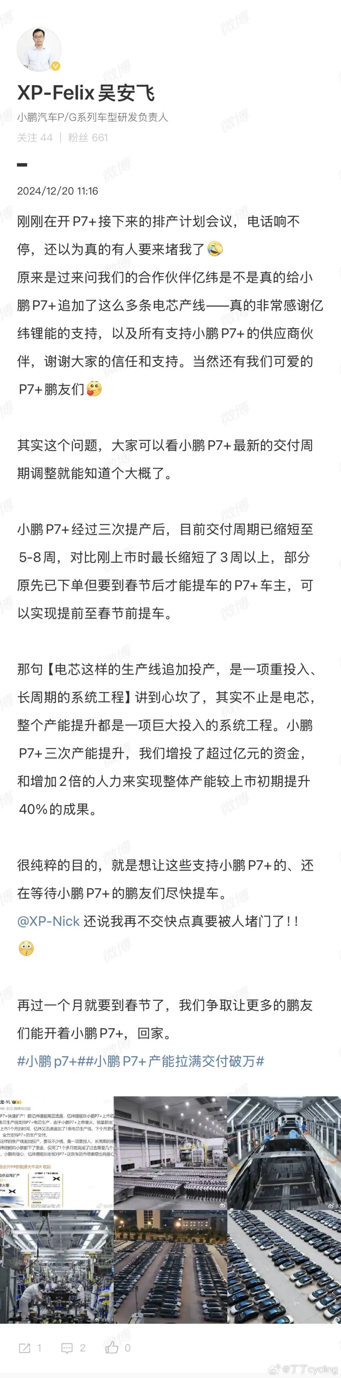 窝棚已经不是当年的小鹏了,现在是真的支棱起来了,大手笔豪掷一个亿,给p7+电芯供应商亿纬锂能加生产线🚘现在p7+的产能已经提到5-8个月了,不得不说小鹏生产和交付能力真是得让夸一夸明天大师兄去和斌哥见面,是否要传授下经验给斌哥哈哈😃#小鹏p7+增投超1亿元扩大产能# #小鹏汽车#
