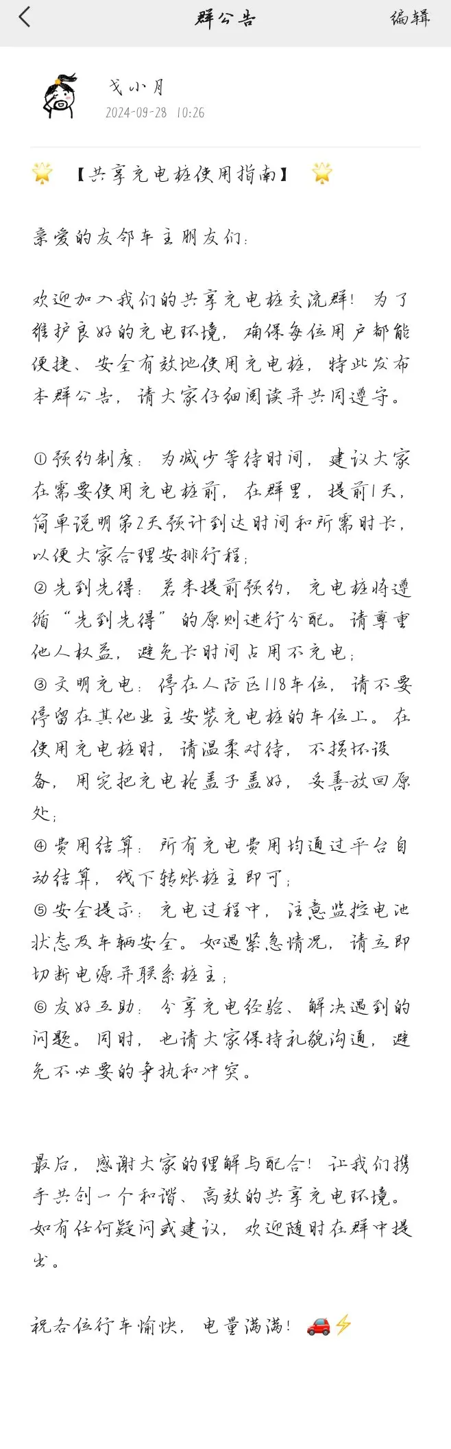 让他们在群里提前预约,我会做个整理笔记,及时更新,保障邻居们一打开群就能看到最新的预约情况,他们也好调整时间🥳同时他们也可以相互交流,比如提前充完艾特下一位“进场”亦或是提醒他们“到点该挪车啦”,相处融洽,经常会讨论一些感兴趣话题,有时还会给我出谋划策,像朋友一样。🤜🏻🤛🏻