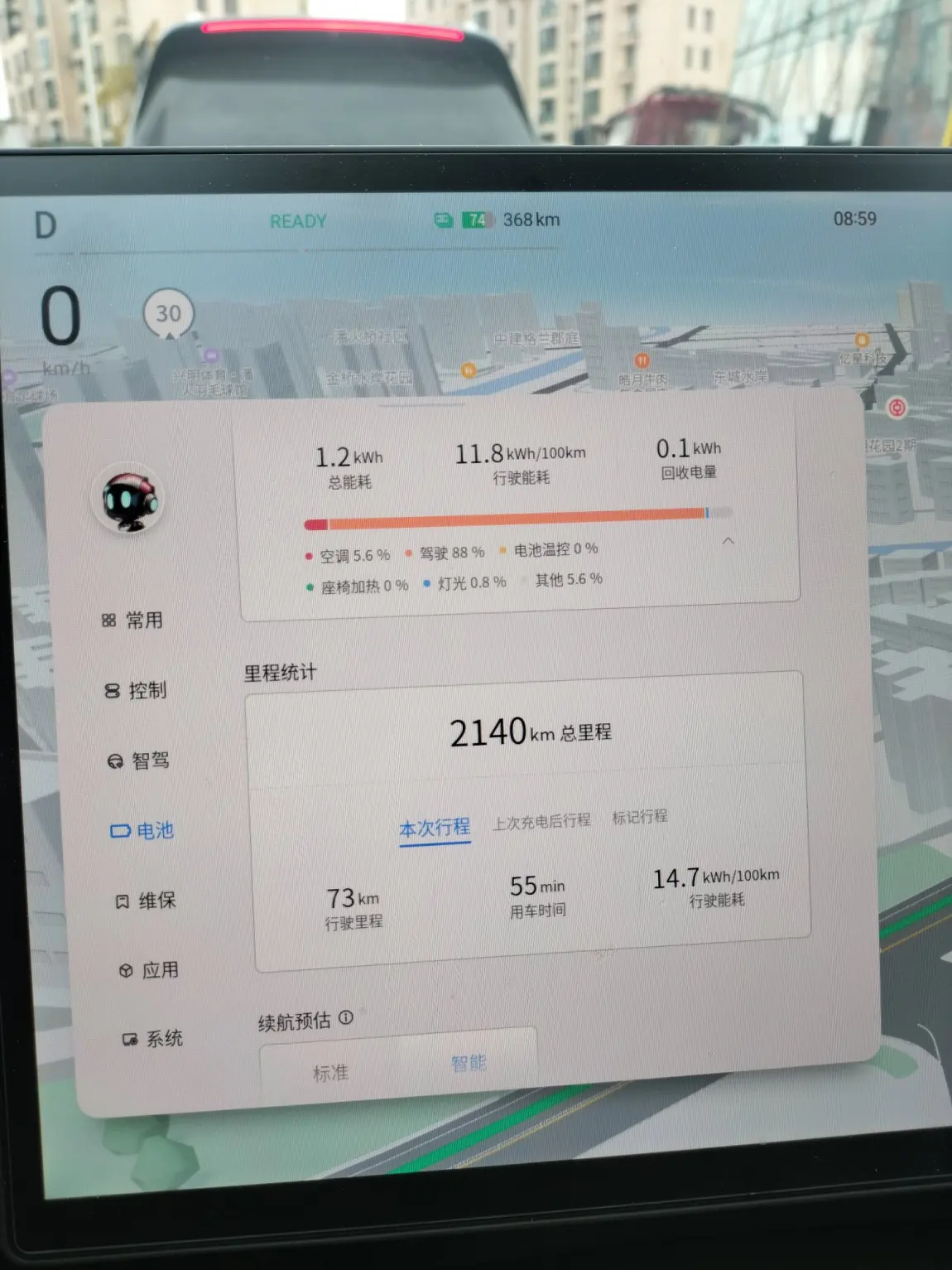 纯高速,110-120之间,下道口堵了一会,能耗还行,空调开25自动,没放音乐,开了导航