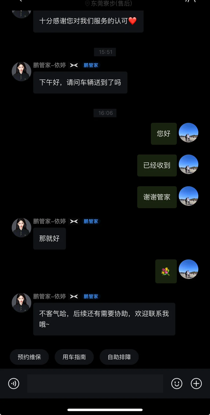 非常感谢东莞寮步小鹏管家-依婷。昨晚我贴了隐形车衣,由于时间较晚,小哥把车送到4S店时已经关门。第二天早上,我一直苦寻对接人员未果,直到联系上鹏管家-依婷。她非常积极地协助我,帮我预约了取送服务并安排上门取车,解决了我的困扰。在此特别感谢她的帮助!