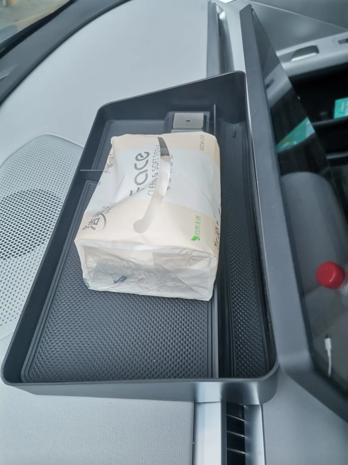 1.显示屏后置物架。采用硅胶材质,具有置物收纳的功能。它不仅能够帮助您整理车内物品,还能作为ETC支架使用,是左右分隔的,我左边放置抽纸,使用很方便又不碍地方;右边放ETC,使用了两个多月,感应很灵敏,跟粘在前挡玻璃效果一样。