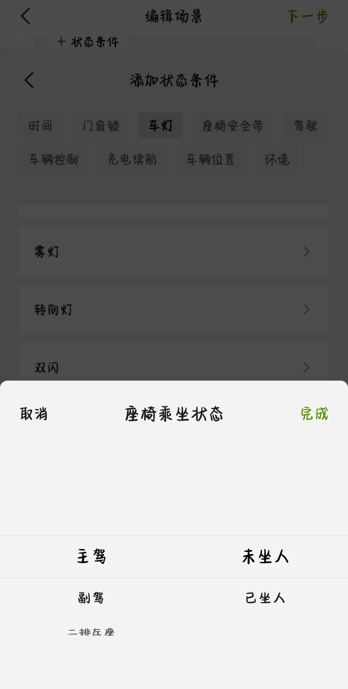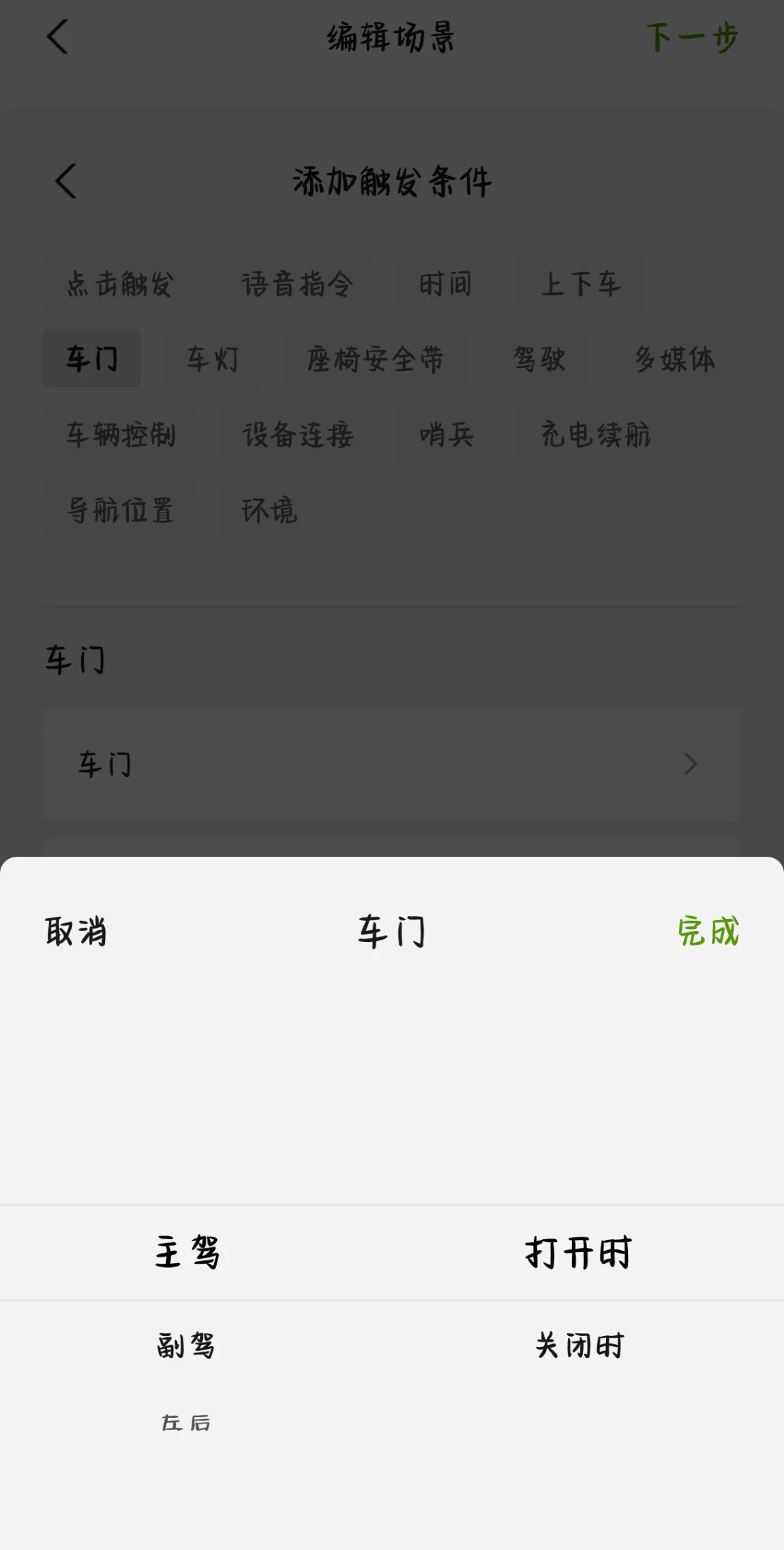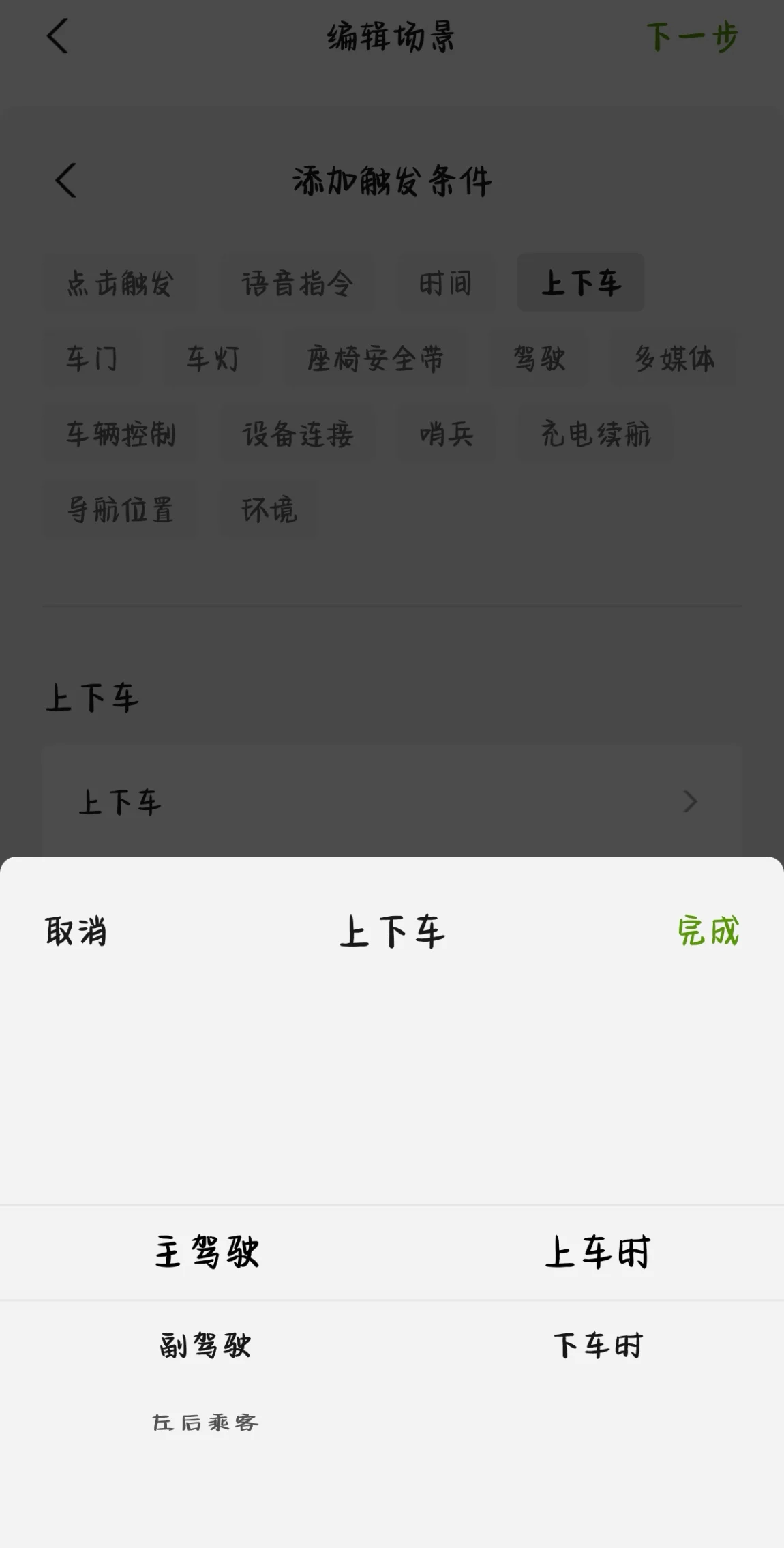 在小鹏的智慧场景中,关于主驾联动模式有三种状态,分别是『上车时』、『车门状态』、『乘坐状态』,当然还有安全带及挂档等启动触发条件!