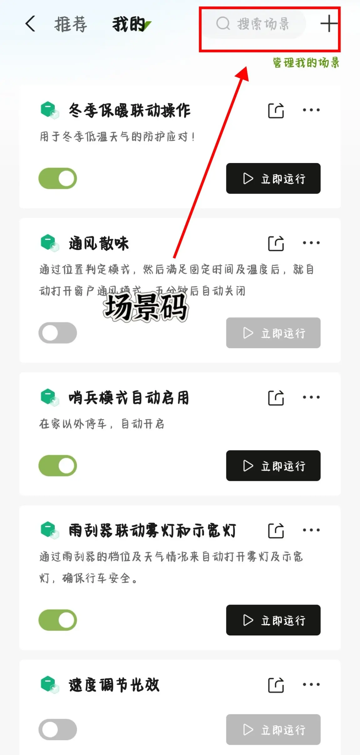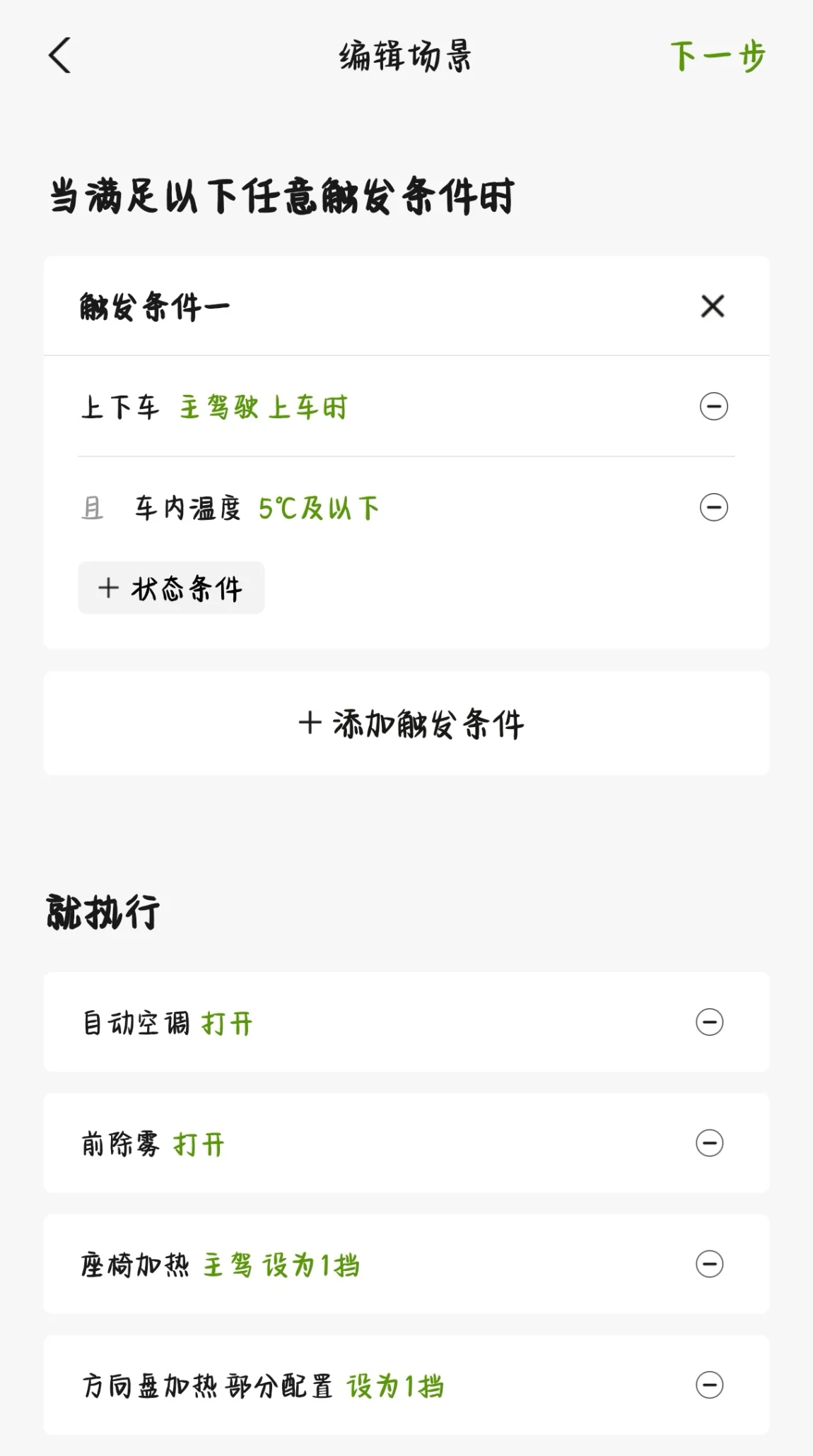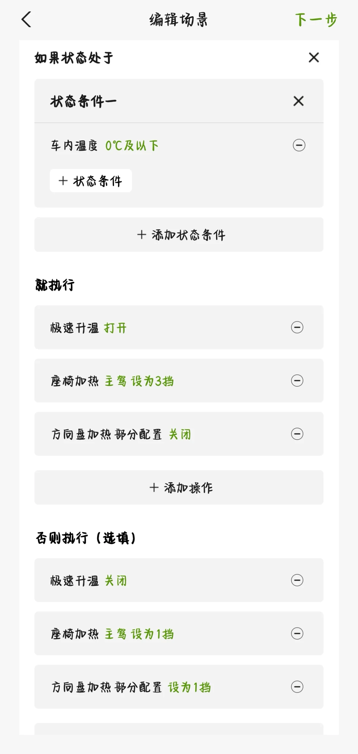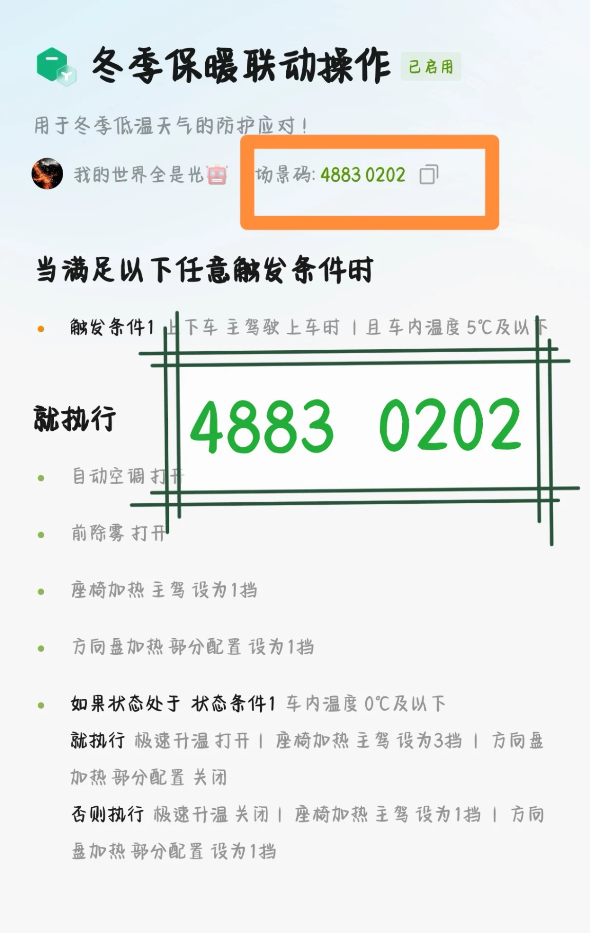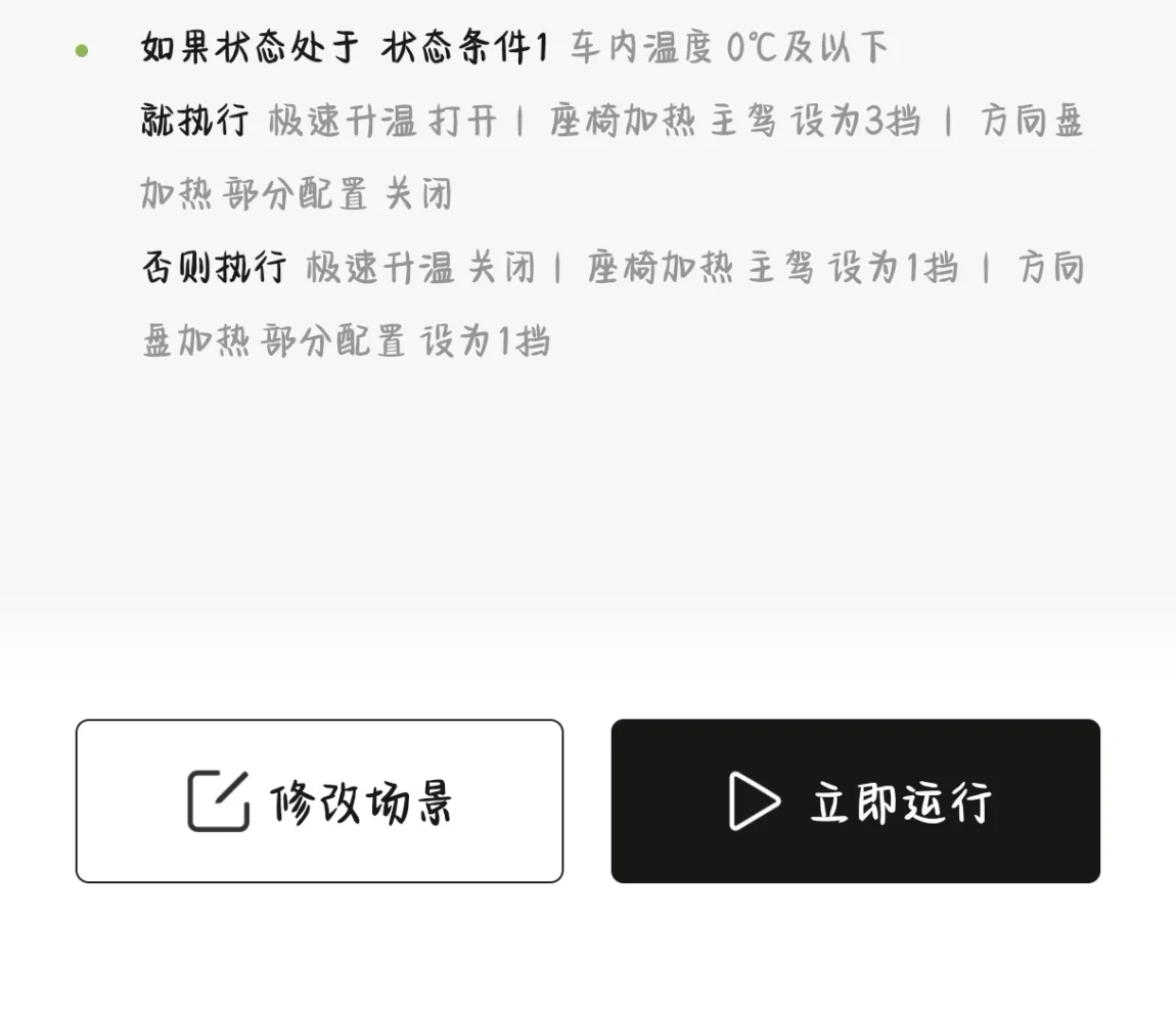 😦通过『车门开启』进行联动『方向盘加热』+『座椅加热』+『自动空调』然后联动温度来判断是否『加大加热』档次和『急速升温』。觉得麻烦,可以直接输入场景码即可!