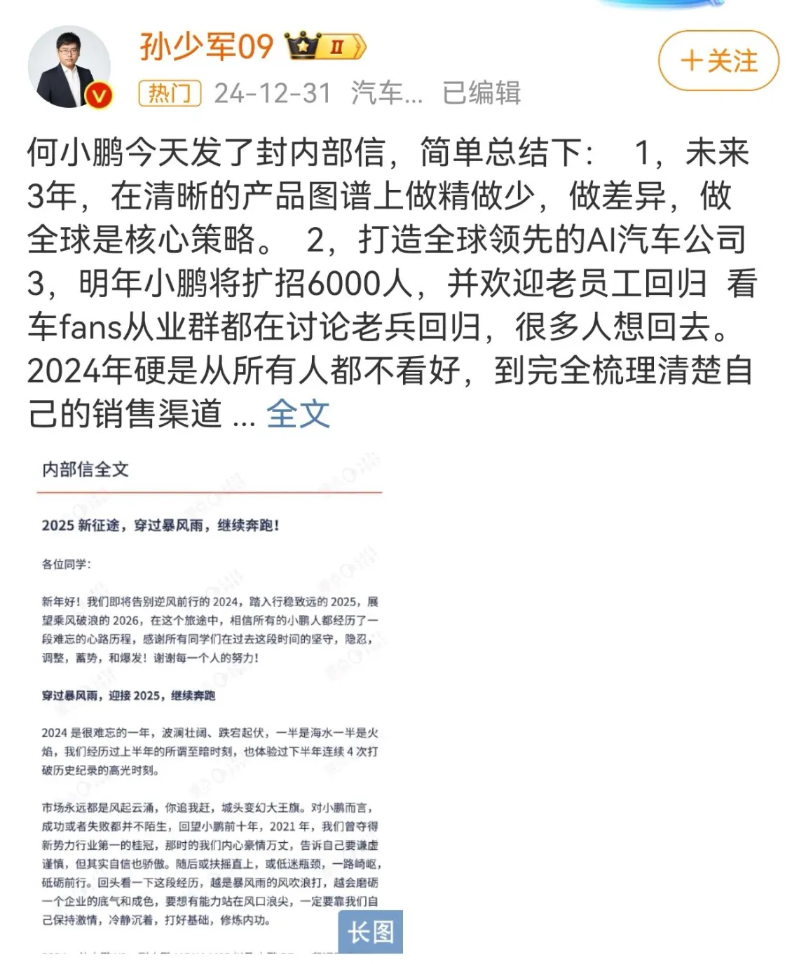 #小鹏汽车 🚀 2025年扩招6000人,新车型技术实力爆棚!最近看了何小鹏的内部信,真的被小鹏汽车的发展蓝图震撼到了!2025年起,小鹏汽车计划在清晰的产品图谱上做精做少,做差异,做全球,这核心策略听起来就超有前瞻性!
