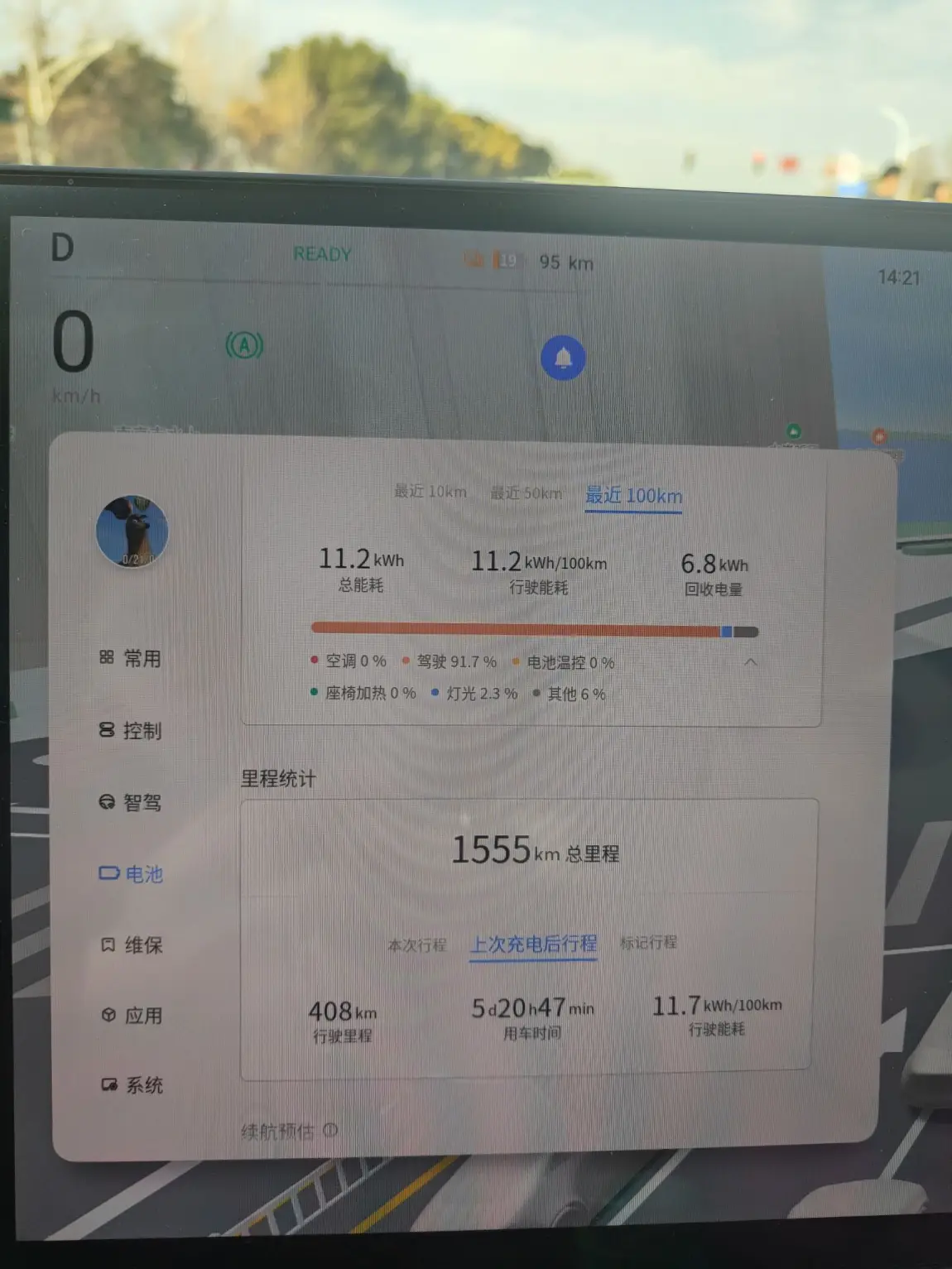 续航:总共充了三次电,每次充电费用50块左右,冲完显示有490公里,最近南京温度大概1到10度,大概还剩20%左右就要冲了,可以满足日常使用。
