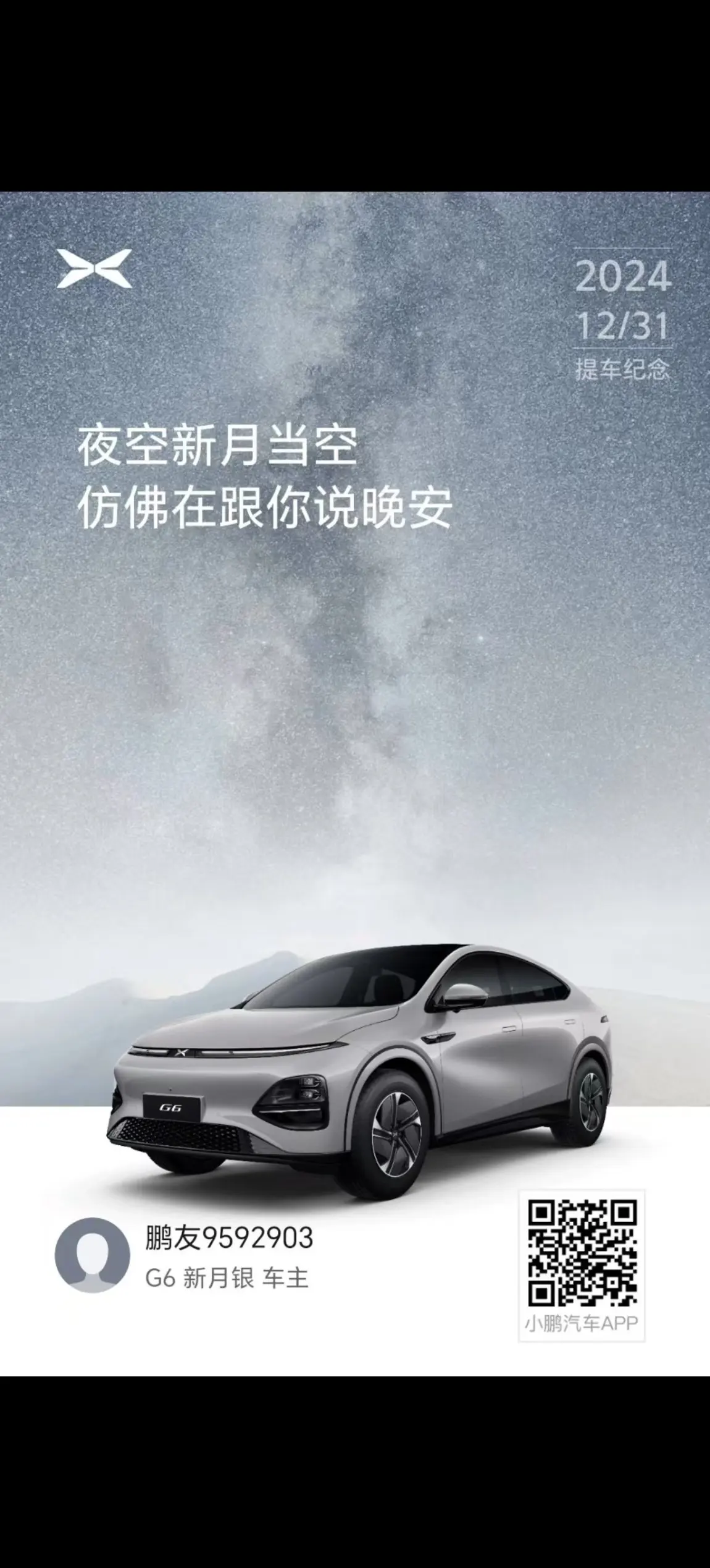 #我的提车作业# 终于在2024年的最后一天提车了,从M03延迟交付退订到年终的最后一天选择G6真的是热爱小鹏呀。。。G6只用了一个上午就定下来了,4s店的服务也很赞,这么帅的鸡柳当我家的新年礼物真是最合适不过了,开了一天就迫不及待的来评论,真是太棒了,丑帅丑帅的。。。越看越喜欢。。。操控也很棒。。车机也很棒。。。总之都是喜欢。。。点赞点赞点赞!