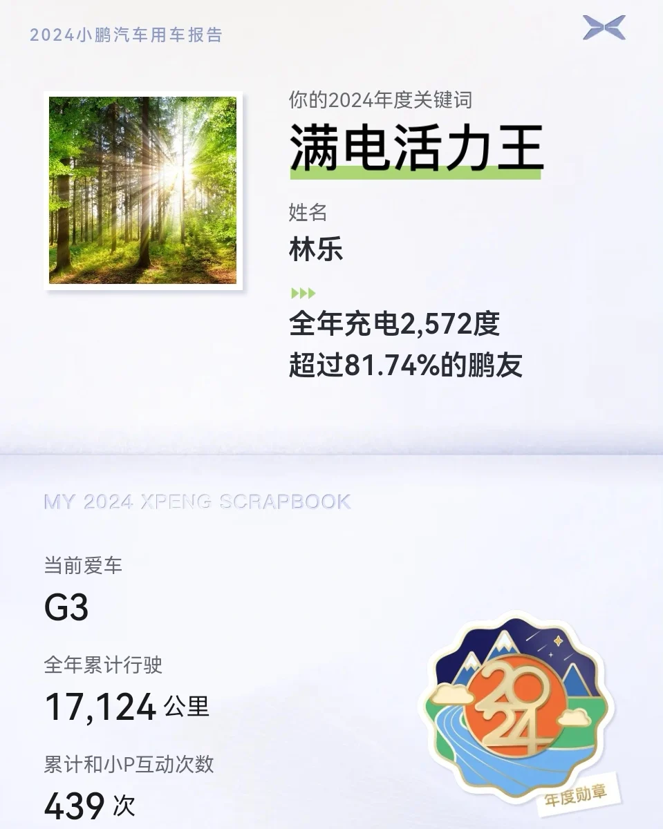 2024年累计行驶17124公里,全年累计充电2923度。快充2572度,家充351度。一度电约跑5.9公里。