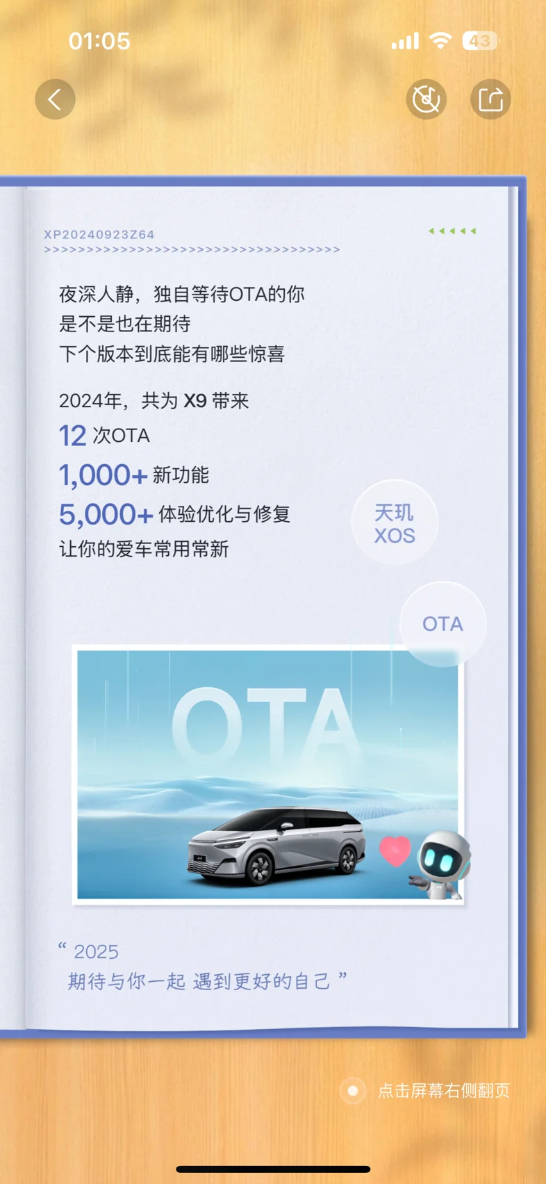 跟X9合作的三个月的时间说长不长说短不短,真真切切感受到小鹏科技带给用车生活场景的巨大改变。对比落灰好久的BMW7系,X9的悬架系统给家人更加舒适的乘坐体验,可变悬架高度即使在高速路段也能让这台5.3米的庞然大物轻松应对迎风和横风侵袭。城市XNGP在导航显示30分钟红色拥堵路段展现了极致的跟车超车能力,极大减轻了驾驶负担。X9让驾乘变成一种了生活乐趣,期待2025与X9深切的融合,期待即将交付的第8座ota。