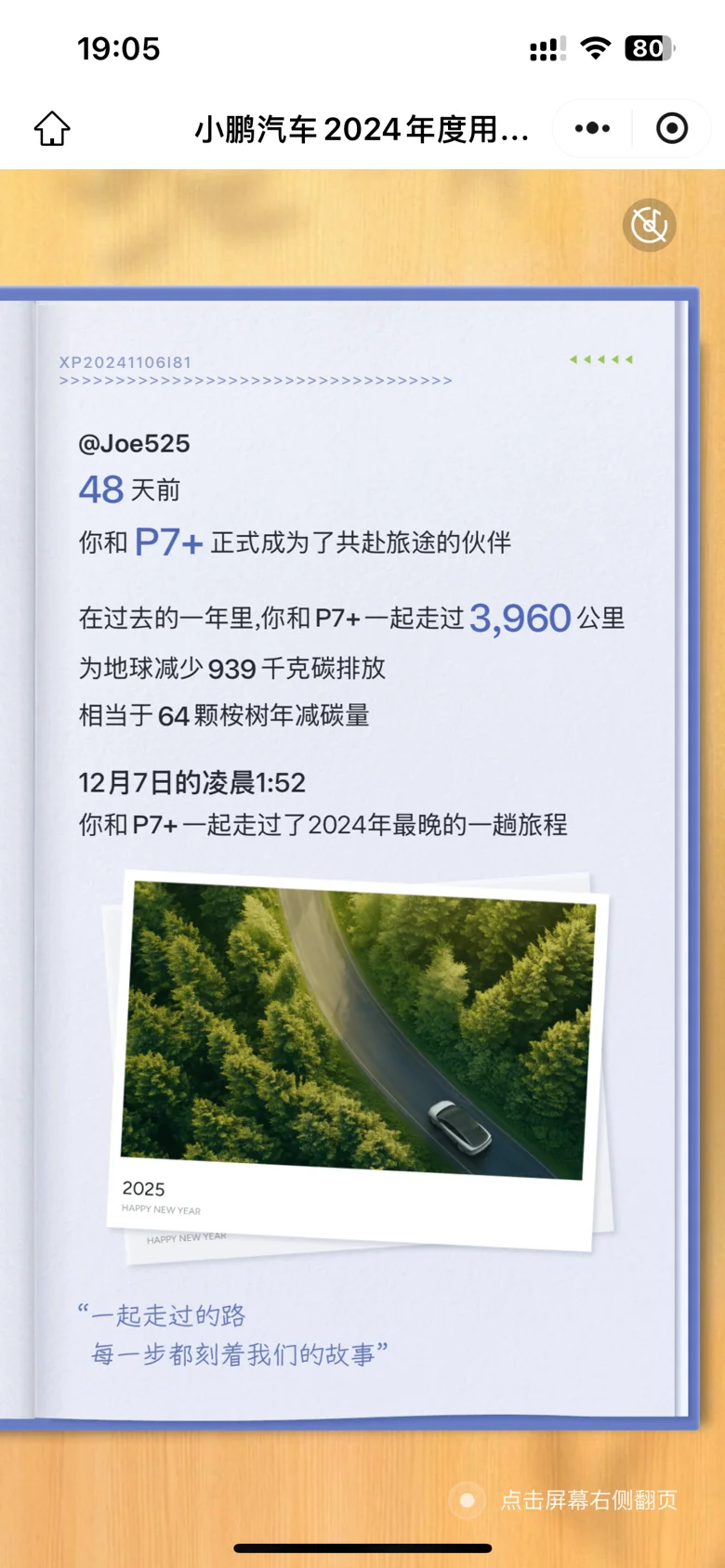 车机系统更是令我倾心不已,高品质的 HIFI 音响搭配上舒适宜人的按摩座椅,共同营造出独属于我的沉浸式音乐天地。每当身心俱疲之时,我便沉浸其中,让紧绷的神经在悠扬的旋律与舒适的按摩中逐渐舒缓放松。回首提车后的这一个多月,四千公里的行程印刻着我与小鹏 P7 + 的点点滴滴,它让每一次出行都充满了别样的乐趣与惊喜。展望新岁,我满怀期待,愿继续与这位可靠的伙伴并肩同行,奔赴下一场山海。