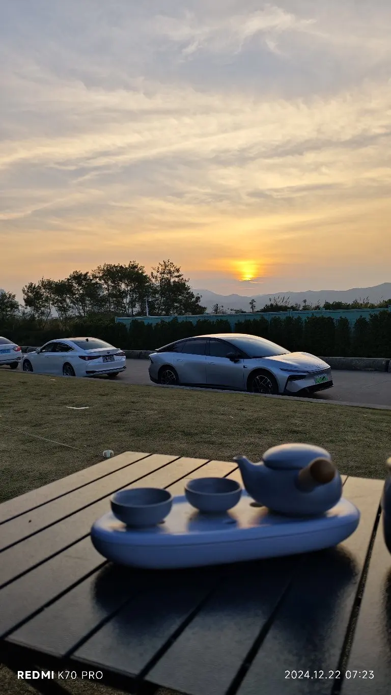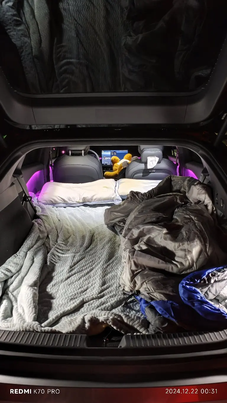 我还尝试了一次和P7+的露营,之前就幻想着有了电车之后必须要试一次在车里过夜。躺在车里仰望满天繁星,清晨则迎着第一缕阳光看日出,真的太惬意了。