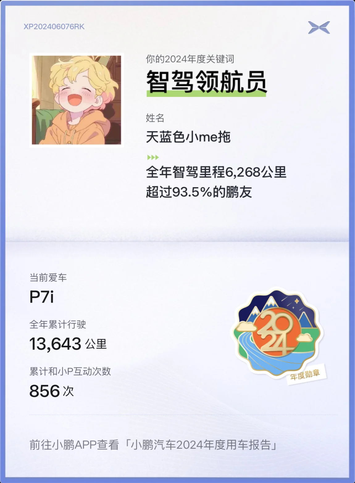 我的2024年度关键词是「智驾领航员」,你也快来看看自己的年度报告吧~这一年有好有坏但是一直是小p一直陪着我,很开心,也感谢