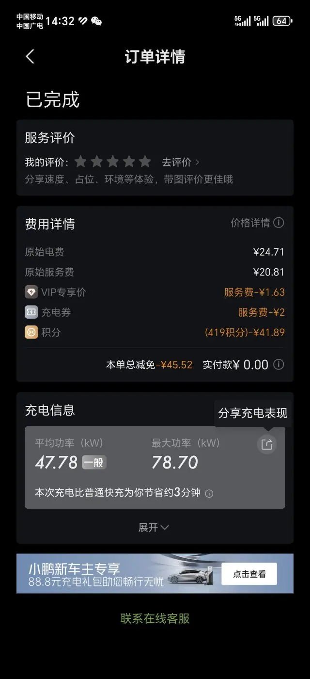 让我惊喜的是,这次充电竟然免费!是的,你没听错,0元电费!这无疑给了我一个大大的惊喜。看来,小鹏在推广新能源汽车上确实下了不少功夫,这样的优惠政策无疑会吸引更多的消费者关注并购买电动汽车。