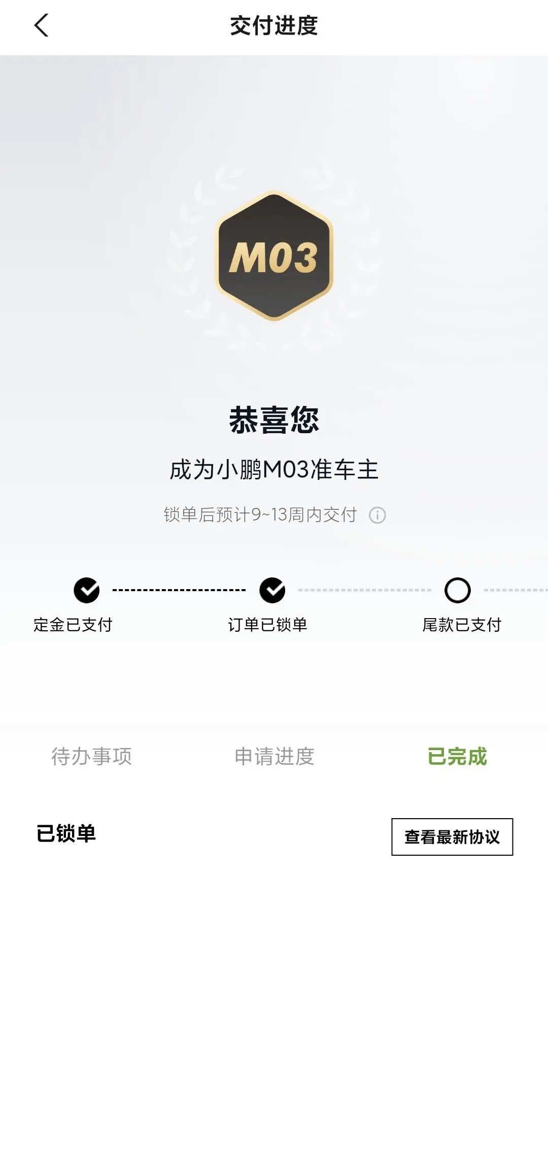 提车啦,从去年八月份开始选车,原本目标在十万内的 小车,看了比亚迪驱逐舰05,五菱星光等等的车,感觉 都不是很喜欢,之前可有看到爆料说小鹏monam03 在十五万左右,看了外形挺喜欢的,但是价格有点超出 预算就没关注了,到了十月份才发现是11.98万起,去 店里看了一下,也没试驾,回去就下定了 从十月中旬下定之后,漫长的等了两个半月,终于在 1月3号提车了,等车期间陆续看到有人分享OTA新功 能,感觉越来越香了 车子挺好开的,比想象中的要好,原本以为十万左右的 都差不多monam03驾驶感受有点越级了,跟我朋友 的特斯拉驾驶起来挺像,朋友也这么说,原本有点担心 的后扭力梁悬挂调教的也很好,所以担心这点的朋友 不用怕,开起来相当舒服 上个月收到消息,有等待积分5000,和送一个精品小 礼物,这两天也到账了,期待一月份OTA的哨兵模式 还有融合天玑系统,希望会有更多新的好用的功能