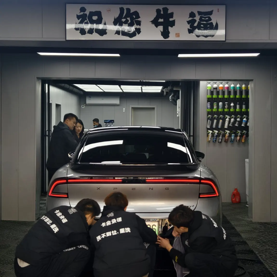 #小鹏影像记录家# 2025,祝您牛逼这张图片是提车不久给车做精洗的时候拍到的,当时店里就我一辆车,几个洗车师傅都为这辆P7+服务,当时看到车子房🏠的牌匾,感觉寓意不错,就拍下了这张照片!照片不专业,大家凑活看,主要是看车跟车上面的四个大字“祝您牛逼”!!!