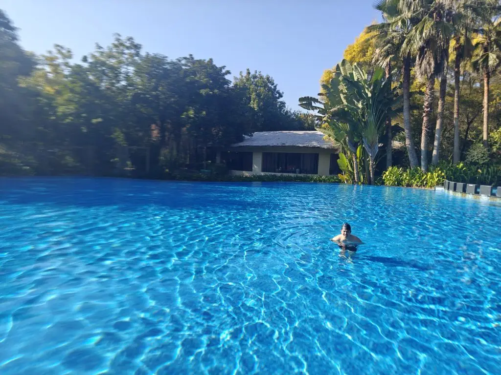 虽然阳光明媚,但是穿着泳裤还是会有点小冷,先游个泳激活一下吧!