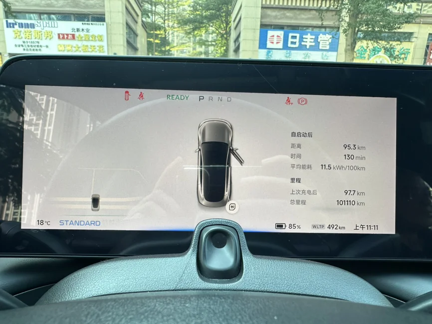 经过了130分钟的路程,到了中午11点11分。比导航上的预估时间早三点钟,差不多。一共走了95.3公里。而能耗只有11.5kWh/100公里。