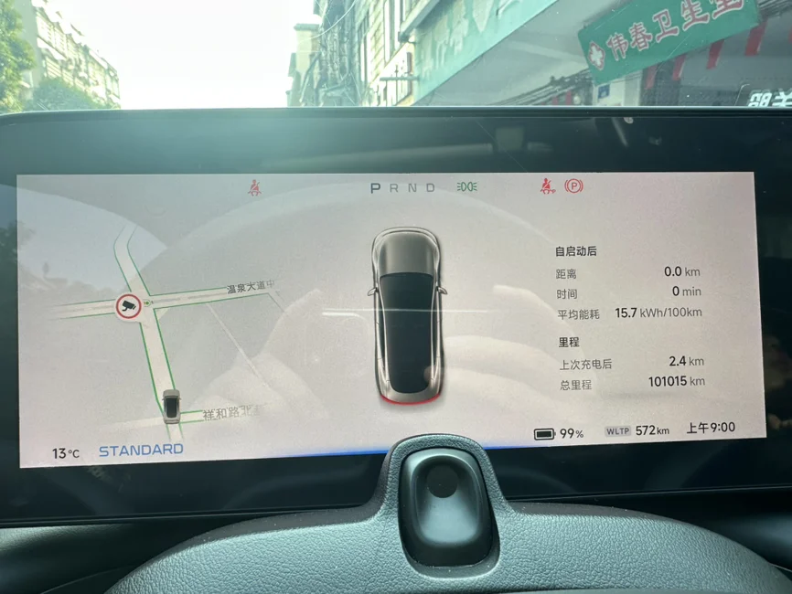 吃完早餐,开始出发。时间正好是9点整。P7的电量基本上是满电,WLTP剩余电量在572公里,车上一共两人,气温13度。驾驶模式使用了标准模式,能量回收设置成低。