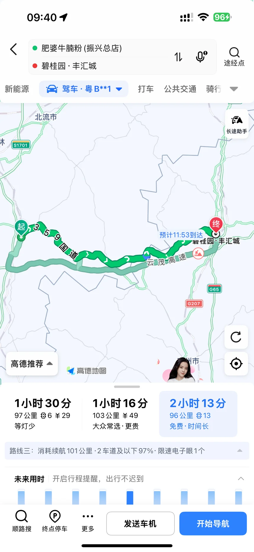 这次路线是广西玉林到广东信宜,里程是95公里,全程不走高速,为了测试直接选择纯国道,在导航上显示一共96公里,一共个红绿灯,用时2小时13分。