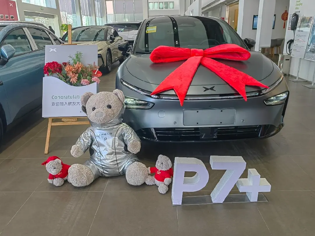 在阳光明媚的午后,我终于迎来了期待已久的小鹏P7+。两个月的等待,终于在这一刻化为满满的喜悦。销售展厅内,新车静静地停放在中央,车头系着鲜艳的红丝带,仿佛在庆祝这特别的时刻。车前摆放着可爱的玩偶和“P7+”的字样,增添了几分温馨和趣味。
