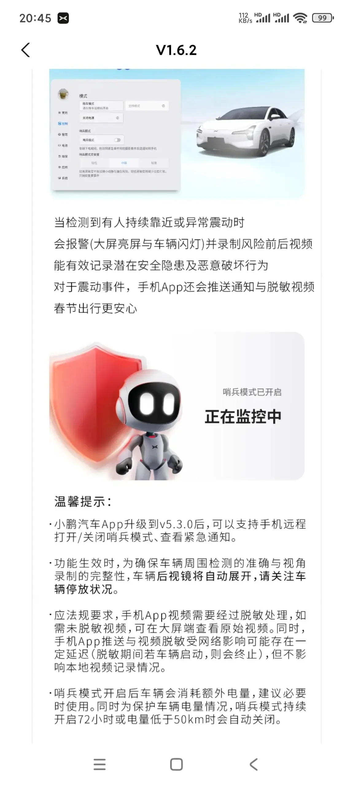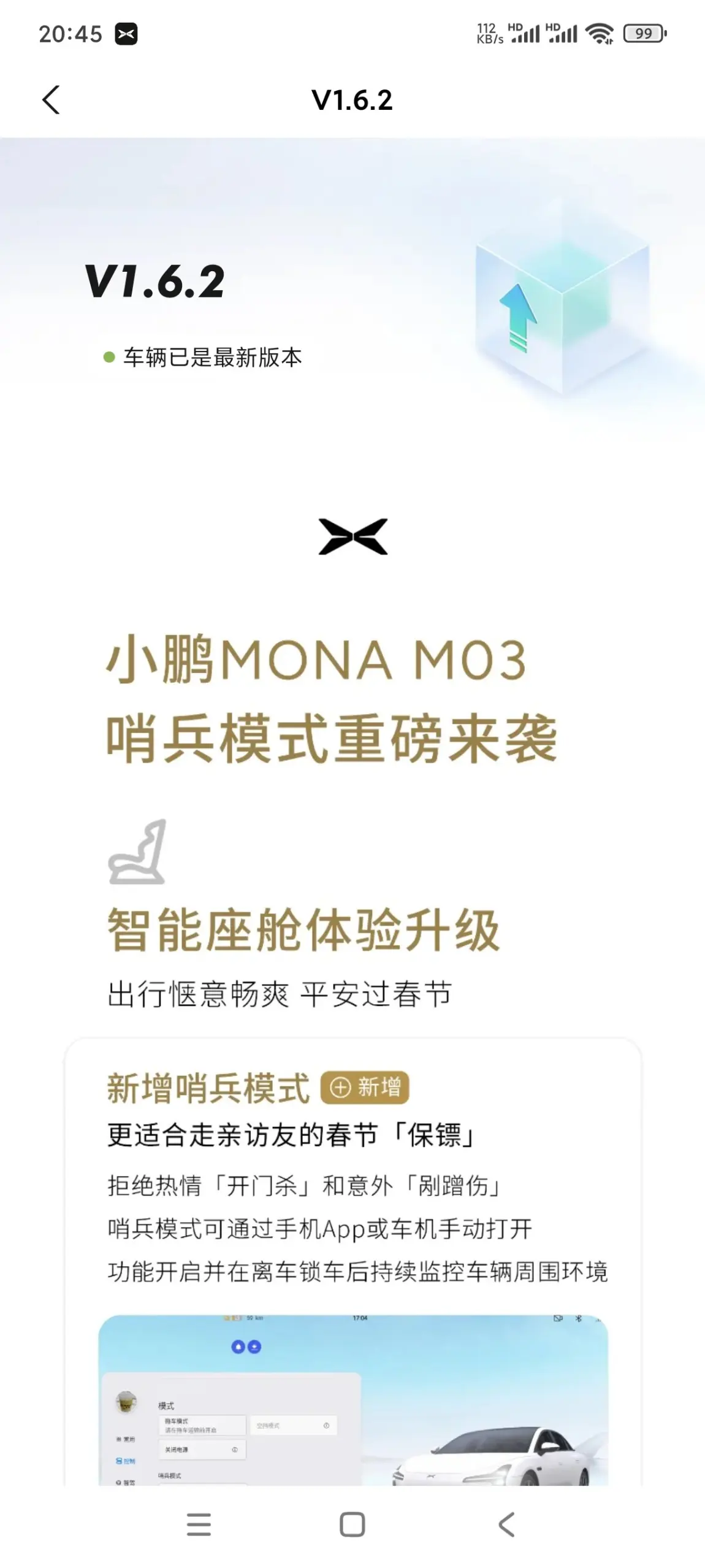 #小鹏MONA哨兵模式已上车# 小鹏还是给力,从买车到现在一月一次ota,次次都有惊喜,现在临近春节,小鹏也是不负众望给大家上期待已久的哨兵模式,哨兵上线第一时间更新,这样春节走亲访友,出行旅游,停车到陌生的地方,就更有安全感了,期待明年mona能尽快融合天机系统,小鹏加油