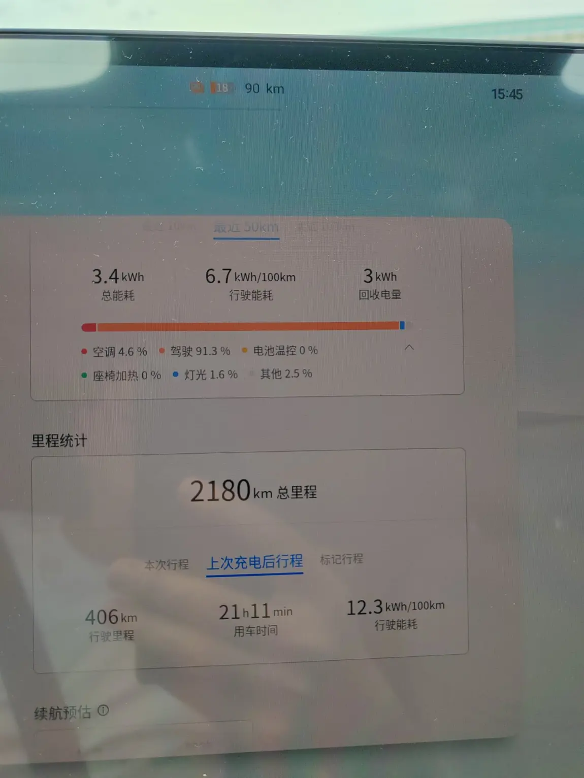 昨晚充满电,今天猛干了400+公里,还有90公里的智能预估剩余里程,续航解释。路途中50%以上自适应巡航使得旅途轻松了很多。