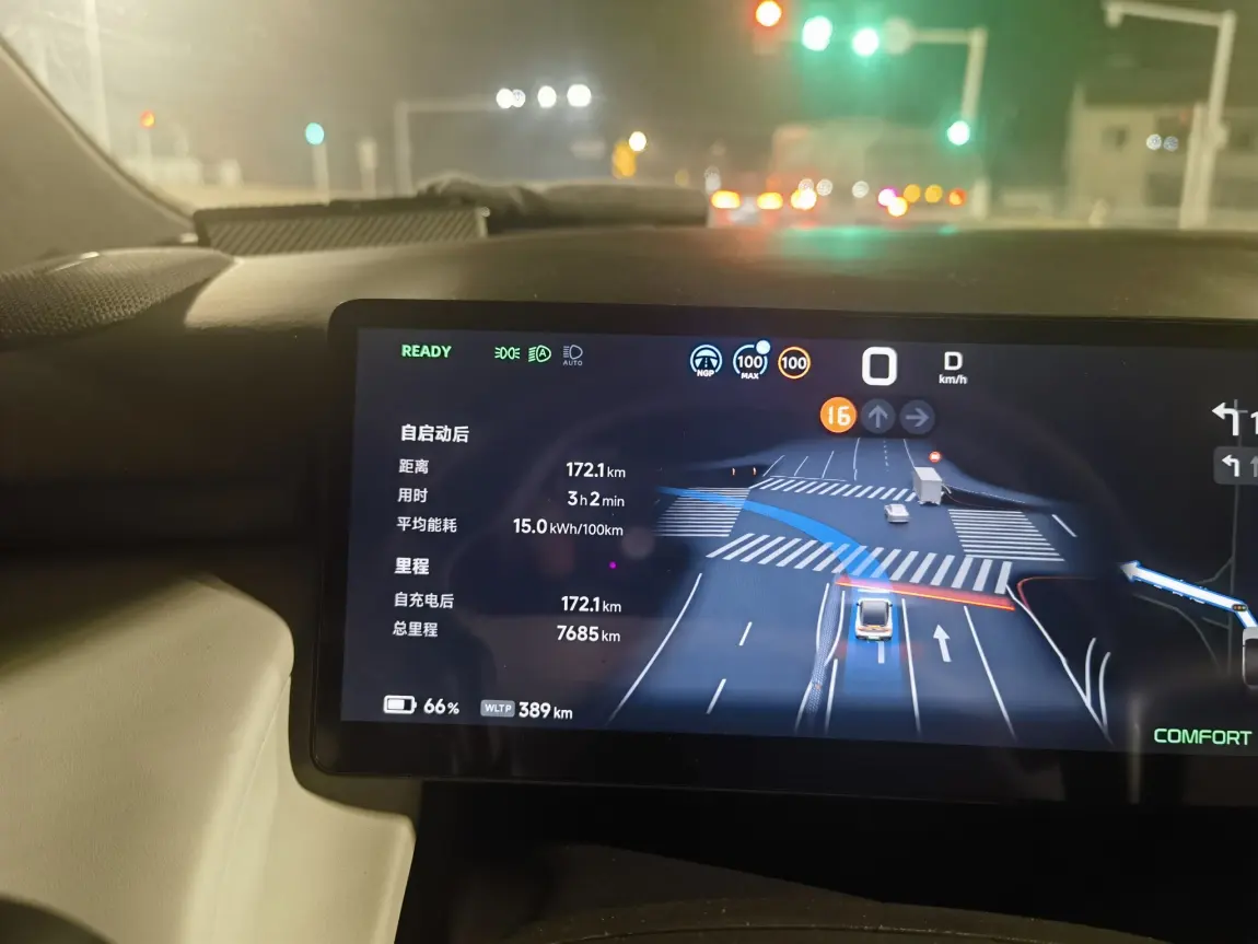 凌晨五点时,我们已经行驶了172公里。尽管车内满载,且空调设置在22℃、2挡风,但电耗仅为15,这充分证明了小鹏的三电系统性能出色。 #能耗报告#