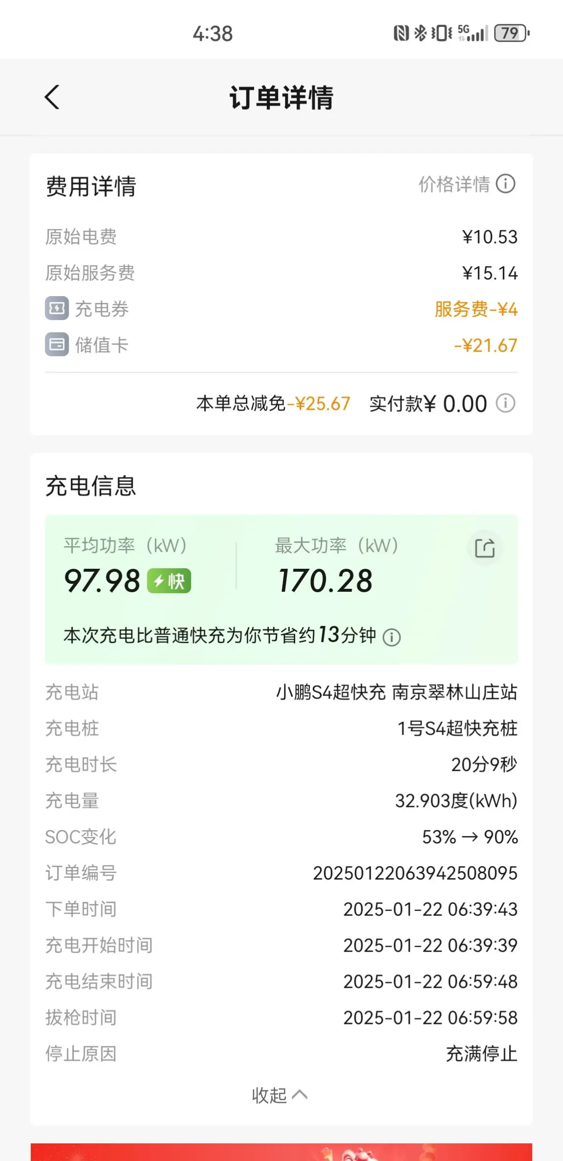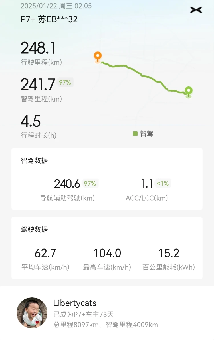 随后,我们到达了小鹏超充南京翠林山庄站。 本段行程共计248公里,其中使用智能驾驶功能行驶了241公里,智驾占比高达97%,几乎无需人工接管。 #XNGP智驾体验#