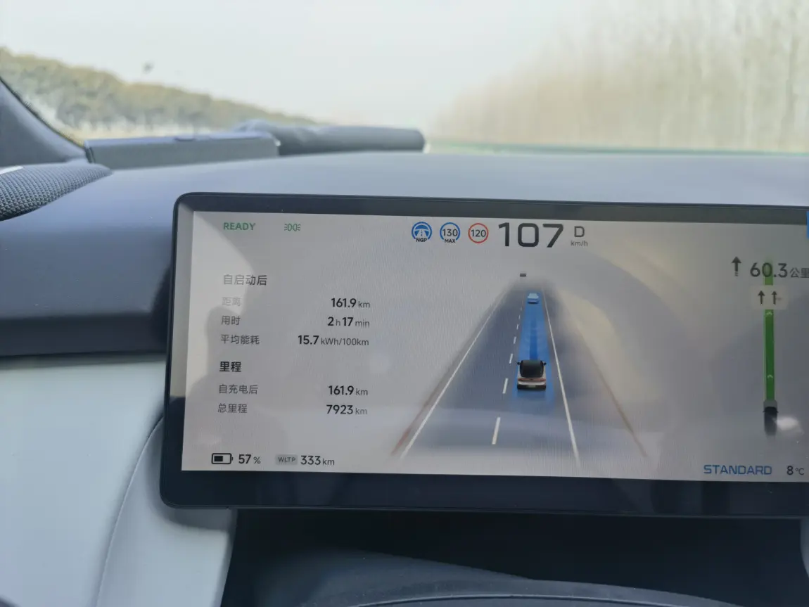 全程我们按照限速行驶,电耗为15.7。 中午11点多,我们顺利到家。